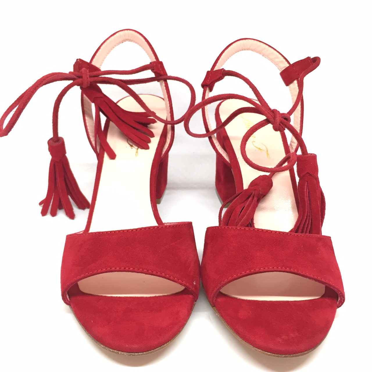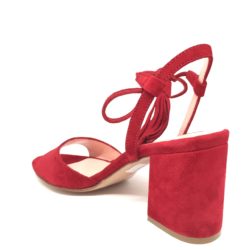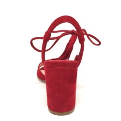 Sandalo in camoscio rosso. Allacciatura alla caviglia, dettaglio nappine. Tacco 7 cm. Fondo cuoio. Made in Italy.