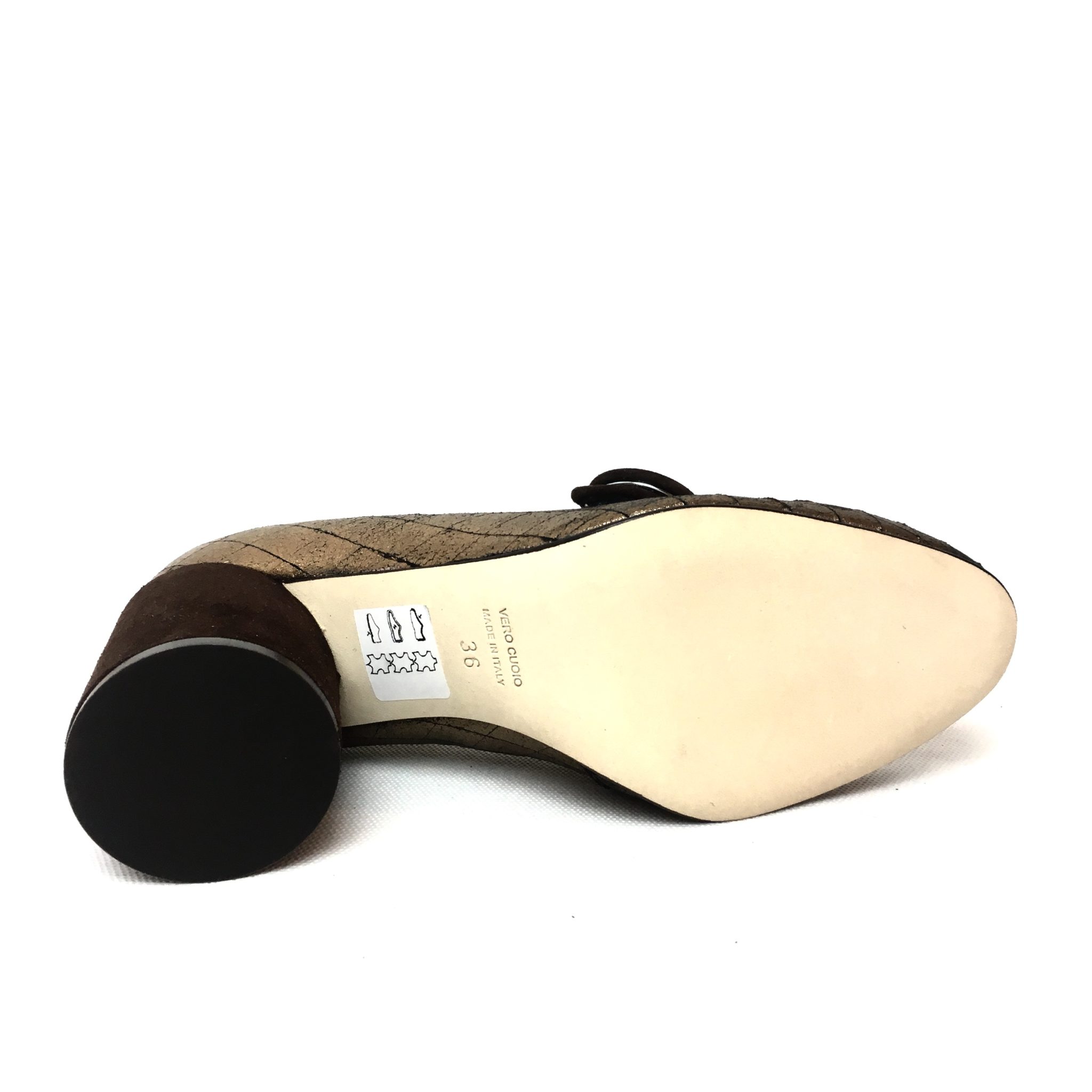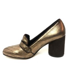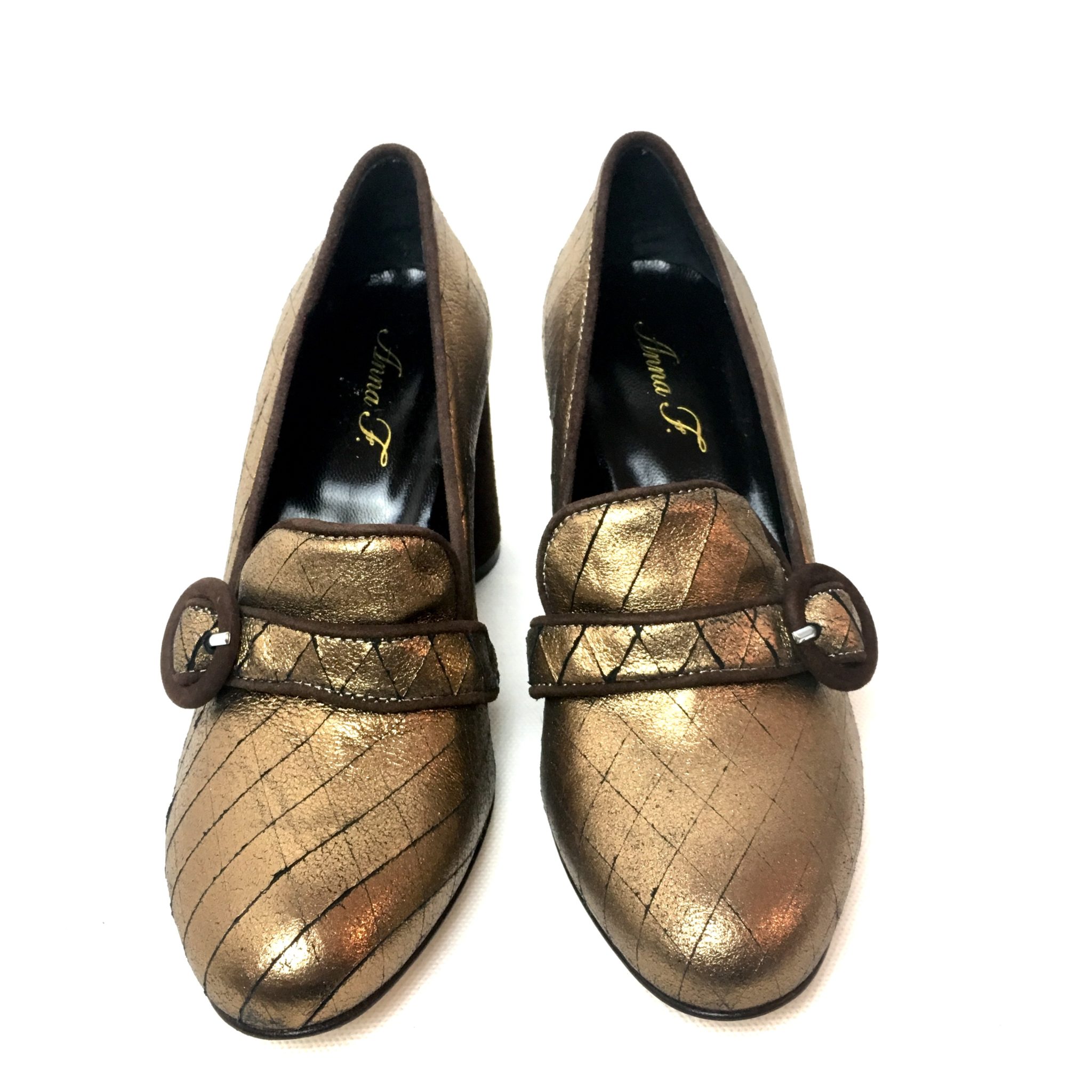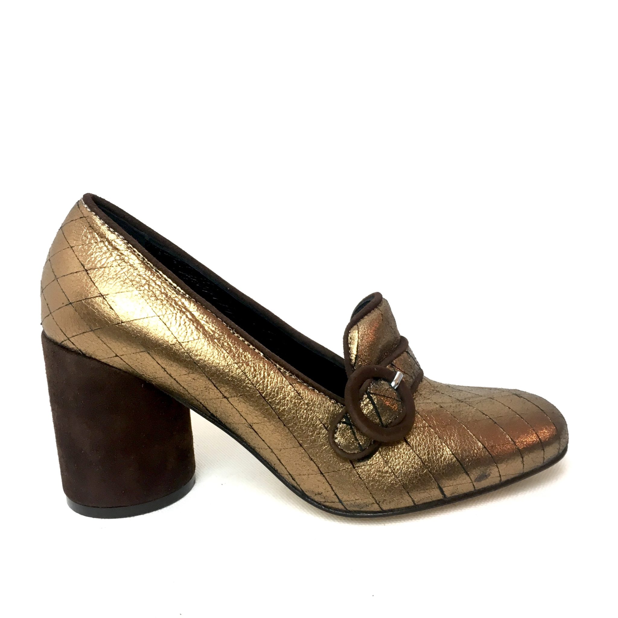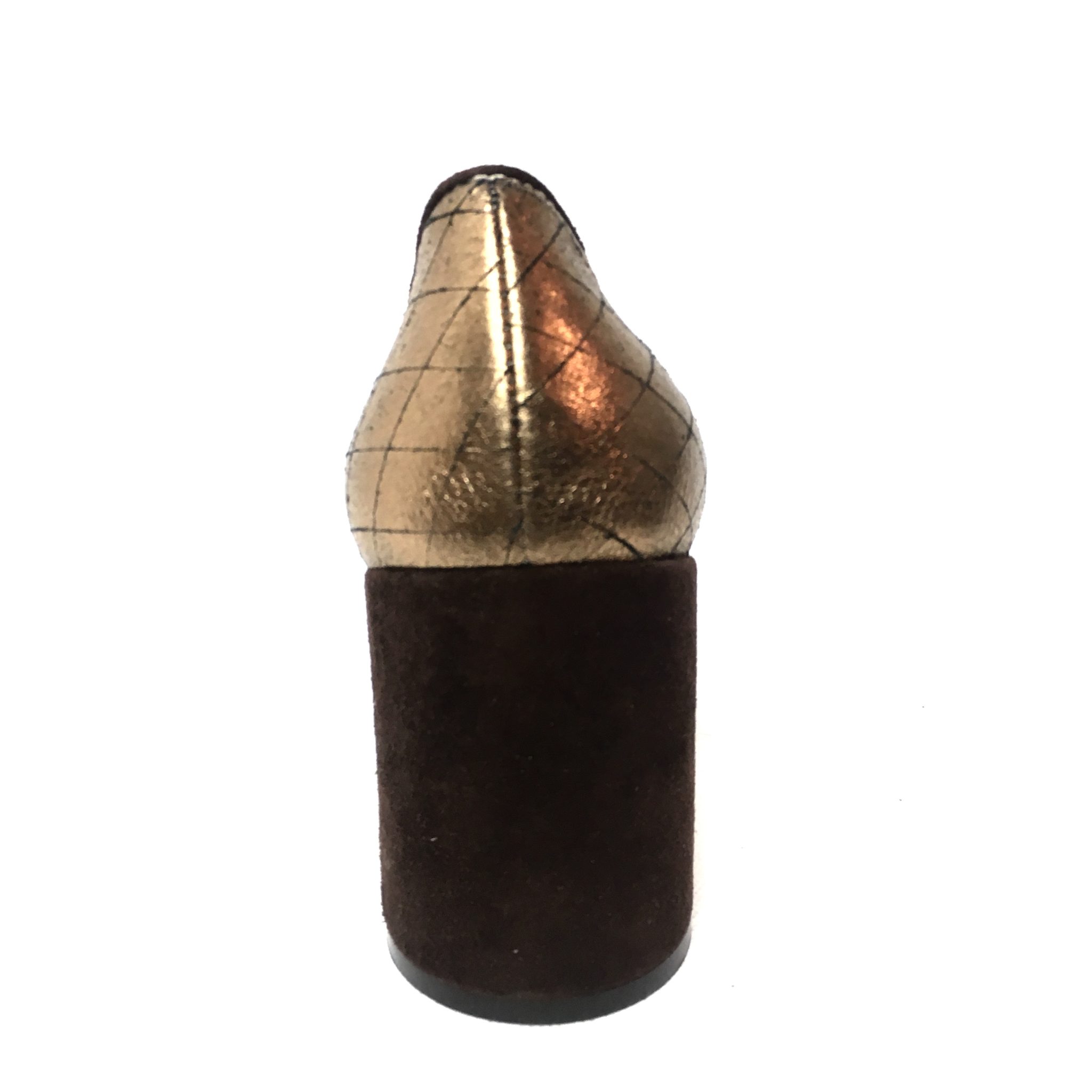 Anna F. mocassino in vitello laminato bronzo intagliato a laser, rifinito in pelle scamosciata cioccolato, tacco fasciato in pelle scamosciata cm.8, fodera in vitello, suola cuoio 100% Made in Italy