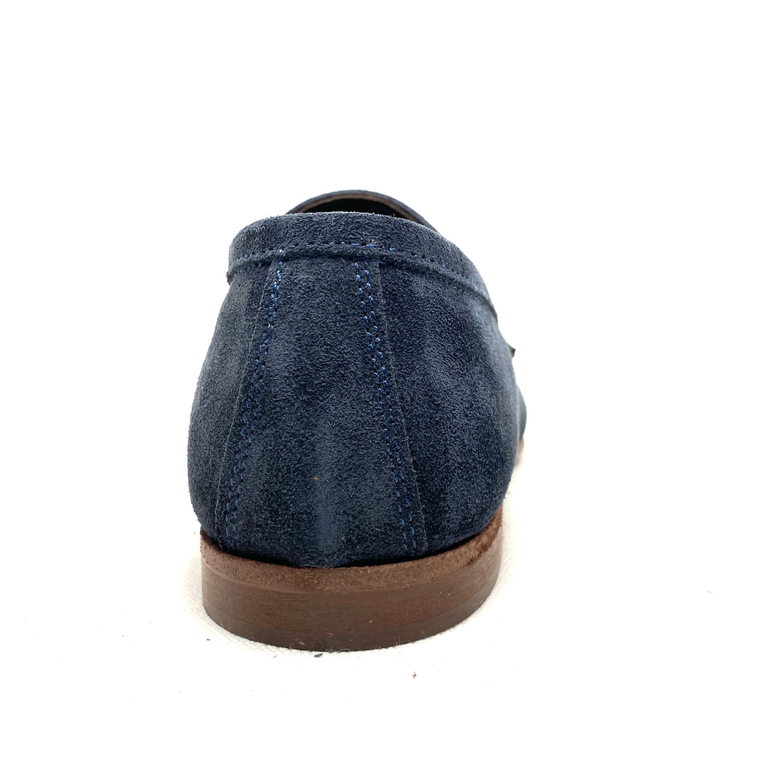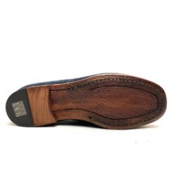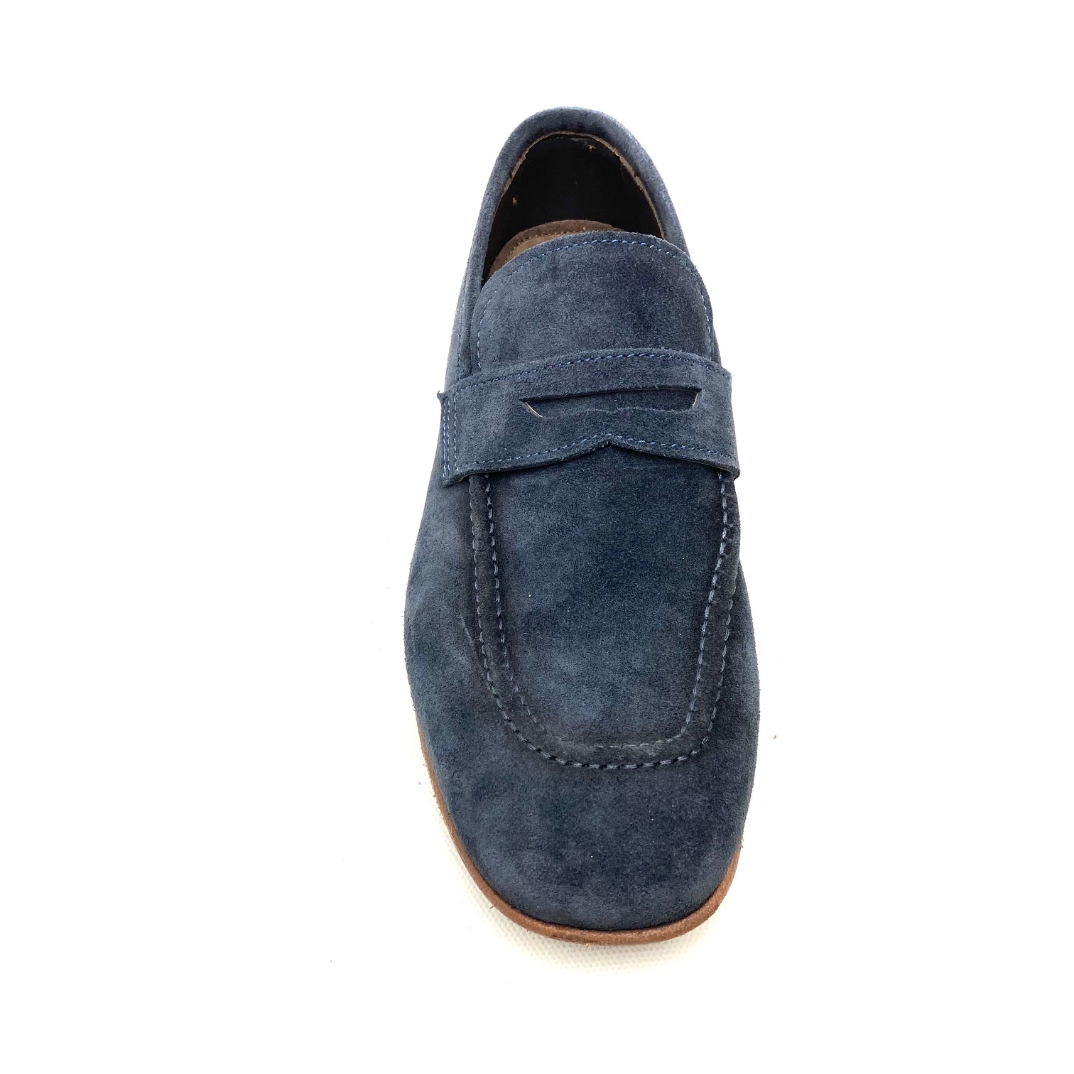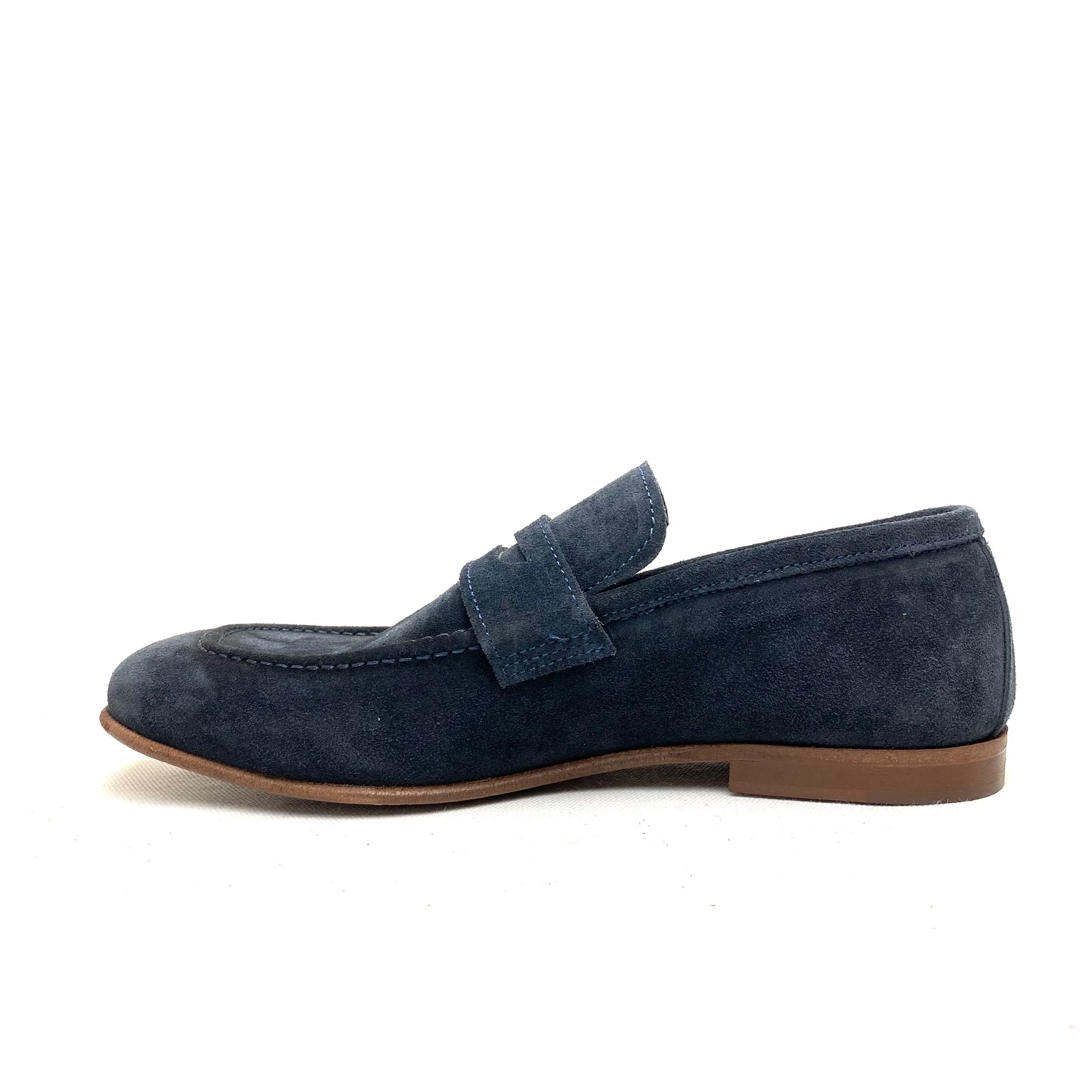 Mocassino in camoscio navy, cucito, fodera pelle forma squadrata, suola cuoio