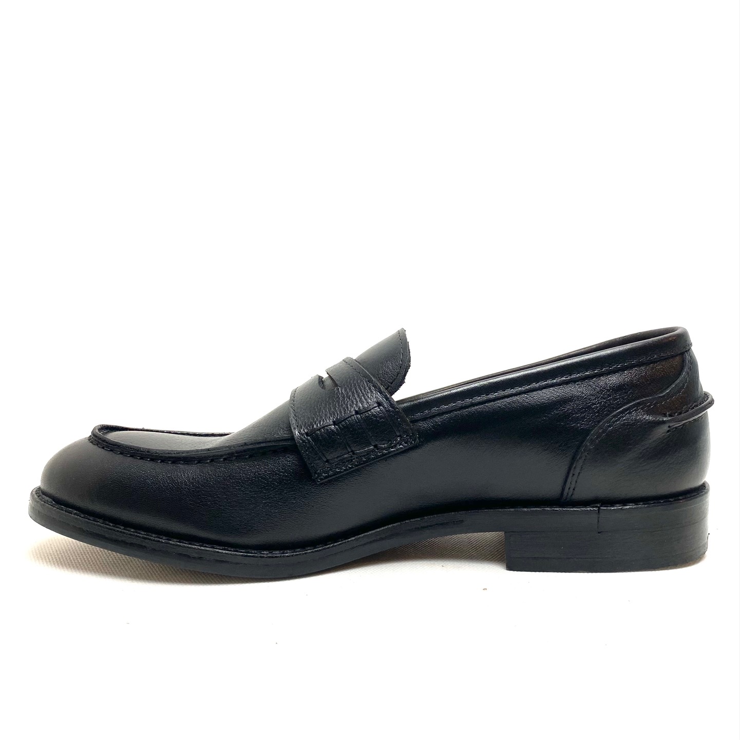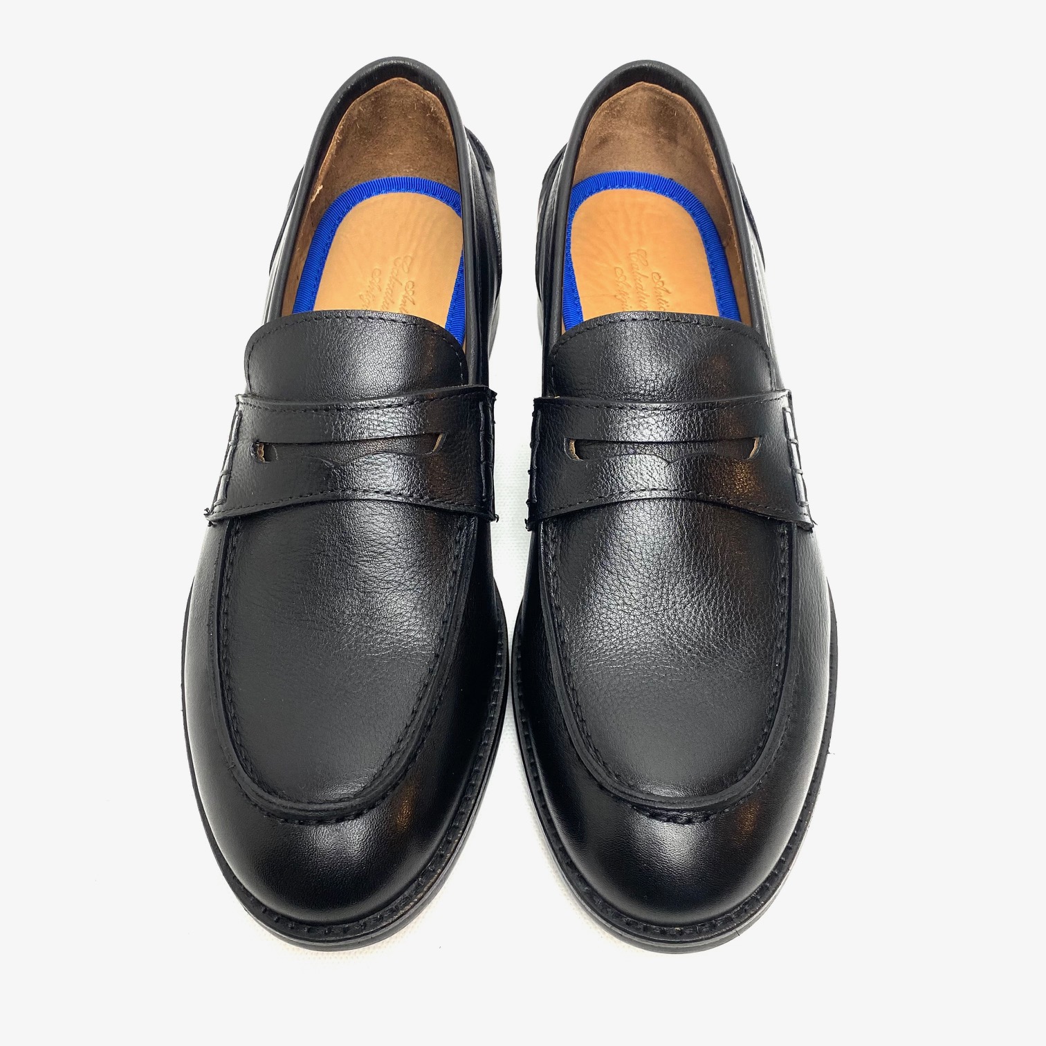 Mocassino modello college in pelle di bufalo nera, fodera pelle, sottopiede con memory. Suola cuoio e gomma. 100% Made in Italy.