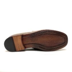 Mocassino in pelle capra taupe, cucito, forma squadrata suola in gomma. 100% Made in Italy