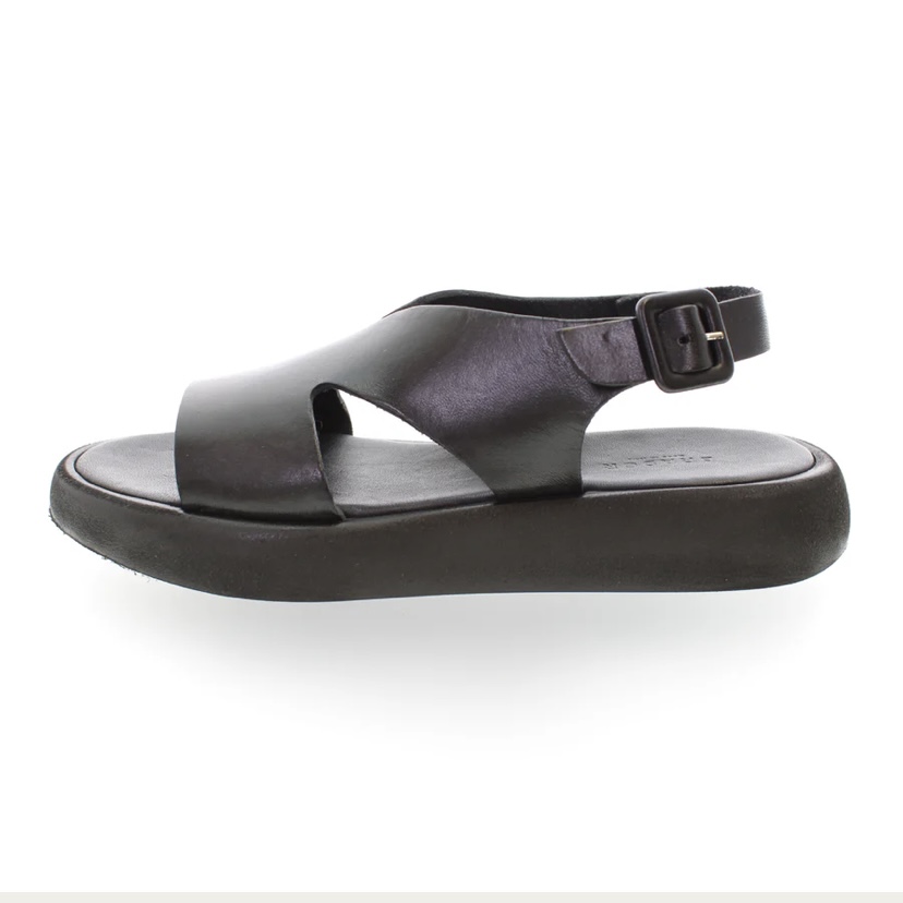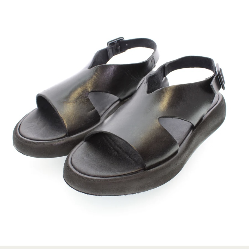 Sandalo nero caratterizzato da una suola dal volume importante e dal design unico, un sandalo strutturato e concettuale ma al tempo stesso utilizzabile nella quotidianità. Ideale un accostamento ad uno stile gitano per una donna che vuole esprimere la sua unicità attraverso un look in cui la calzatura domina la scena.