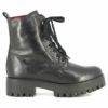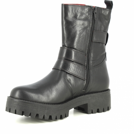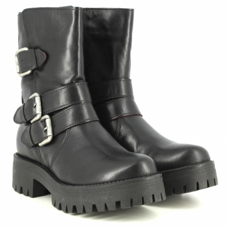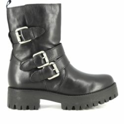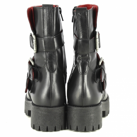 Buffalo Mauve Morn biker in pelle nera spazzolata. Dettaglio triplice fibbia.Fodera in pelle. Tacco gomma 4cm.Platform 2.5cm. Zip laterale. Suola in gomma ( carrarmato).