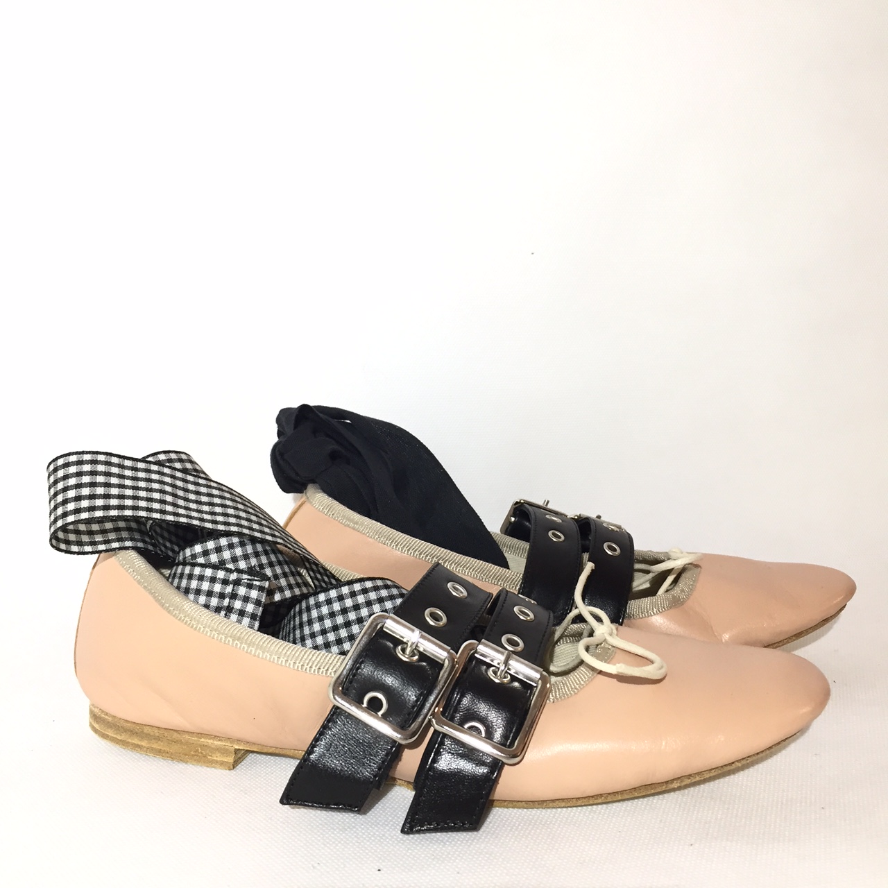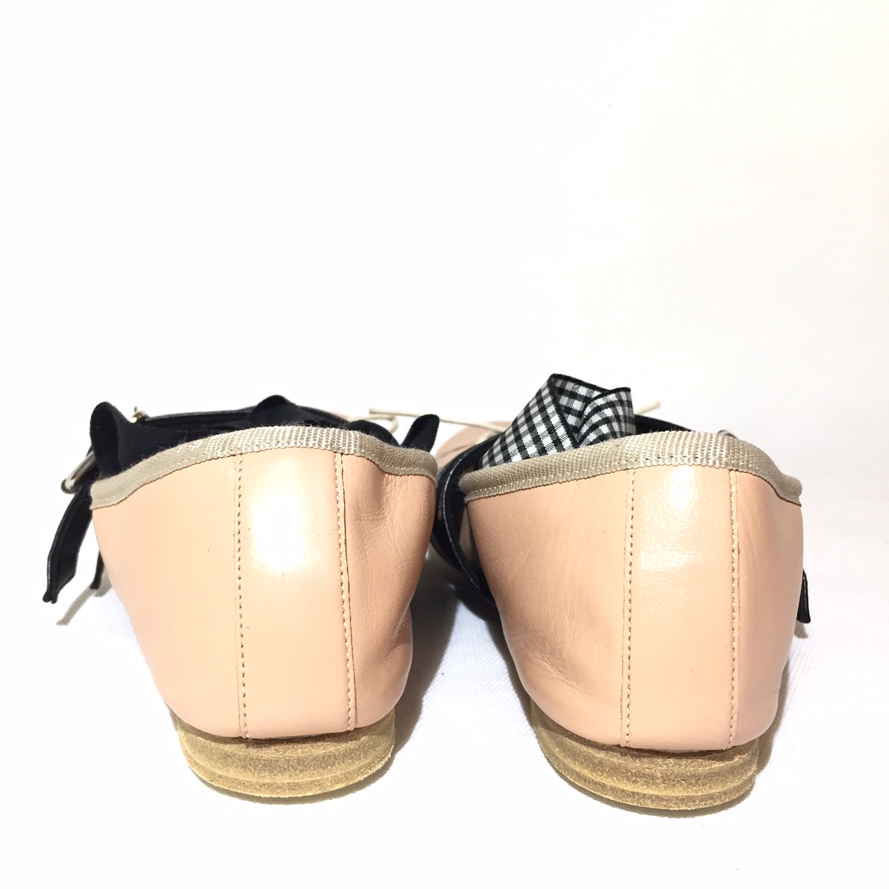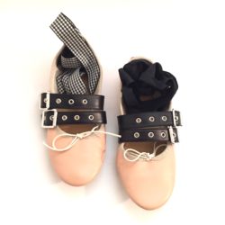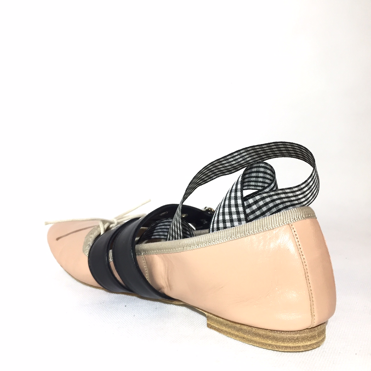 Ballerina in nappa rosa nude. Fiocchetto frontale e doppia fibbia in pelle nera. Nastro alla caviglia (estraibile): vichy bianco/nero e tinta unita. Fondo cuoio. Made in Italy.
