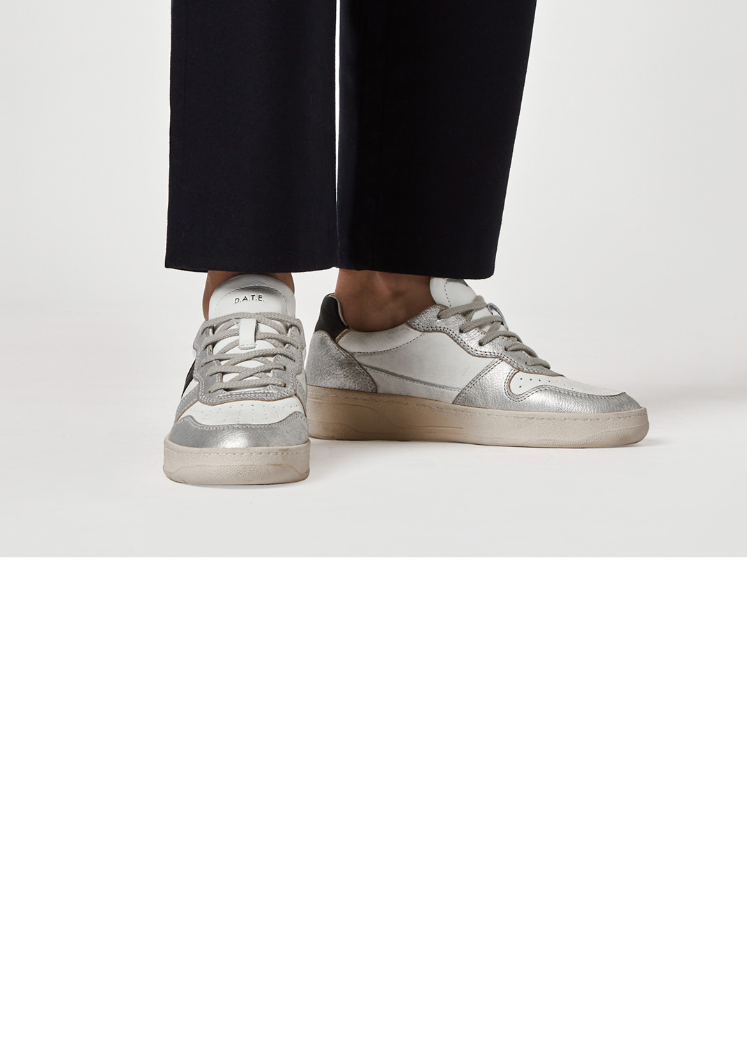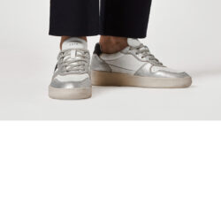 Sneaker bassa in pelle colore bianco con inserti in pelle laminata colore argento. La punta è traforata per una maggiore traspirazione. Sulla linguetta in pelle è impressa la scritta D.A.T.E. I lacci sono in cotone e il codice e il logo quadrato sono impressi lateralmente. La banda laterale è in pelle colore nero. Il talloncino posteriore è in pelle colore nero. Fodera in pelle e spugna di cotone. Il soletto interno è rialzato di 2.5 cm per un migliore comfort. La suola in gomma è alta 2 – 3.5 cm. Tutti i materiali selezionati sono Made in Italy.