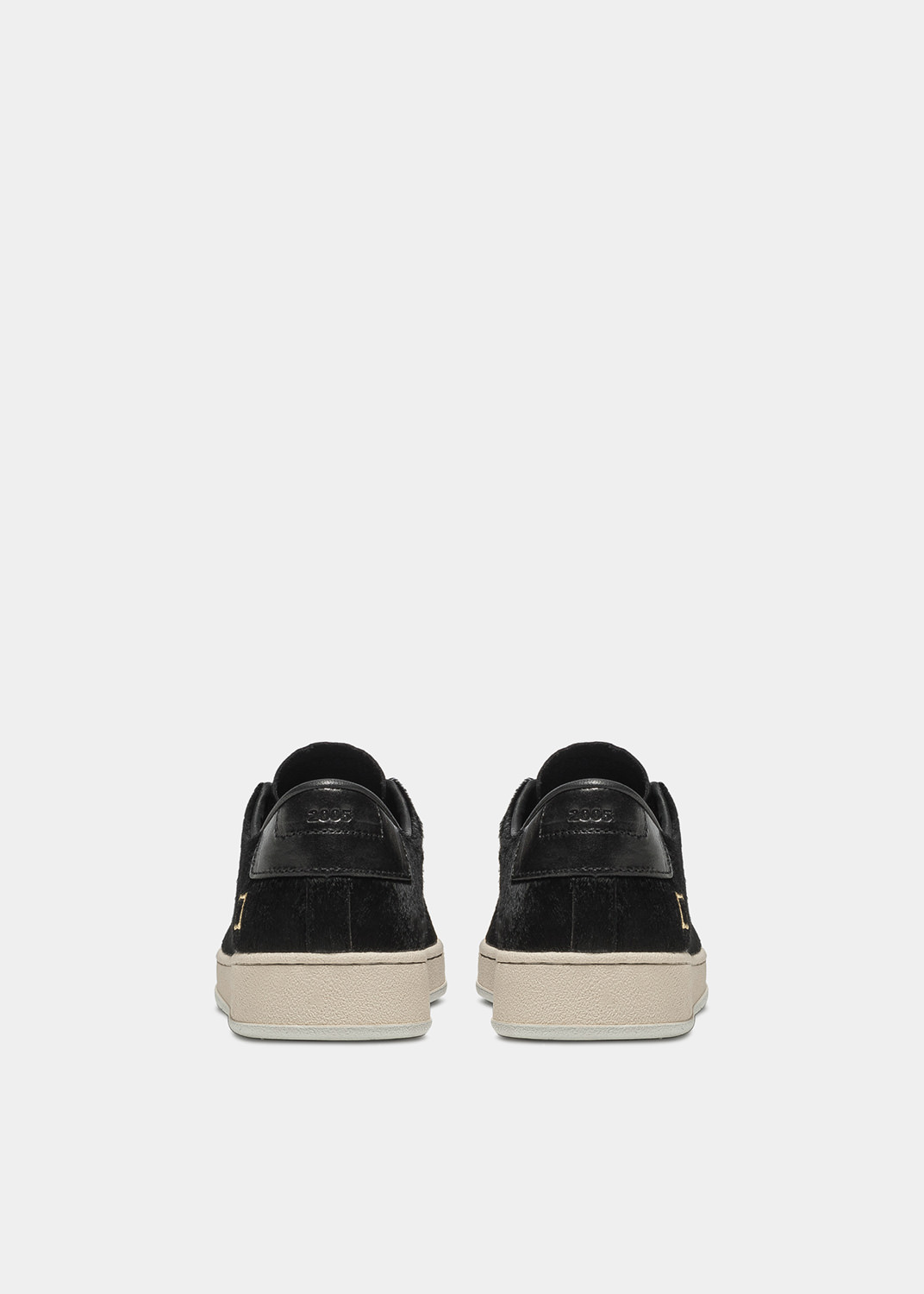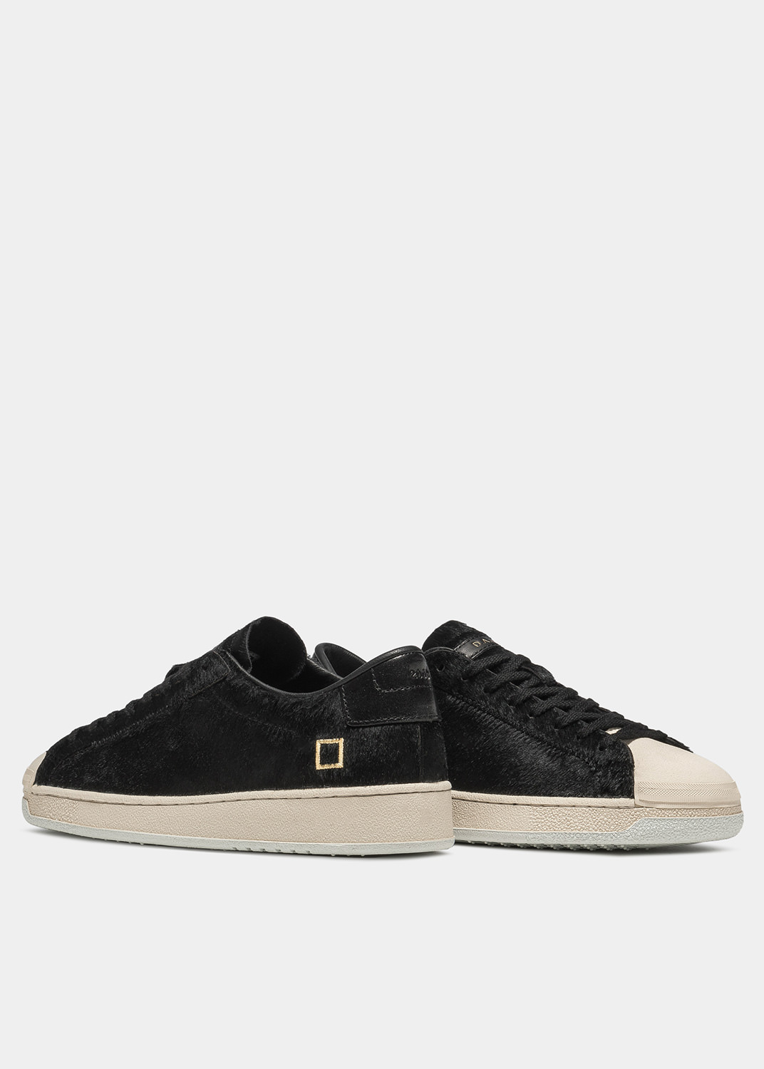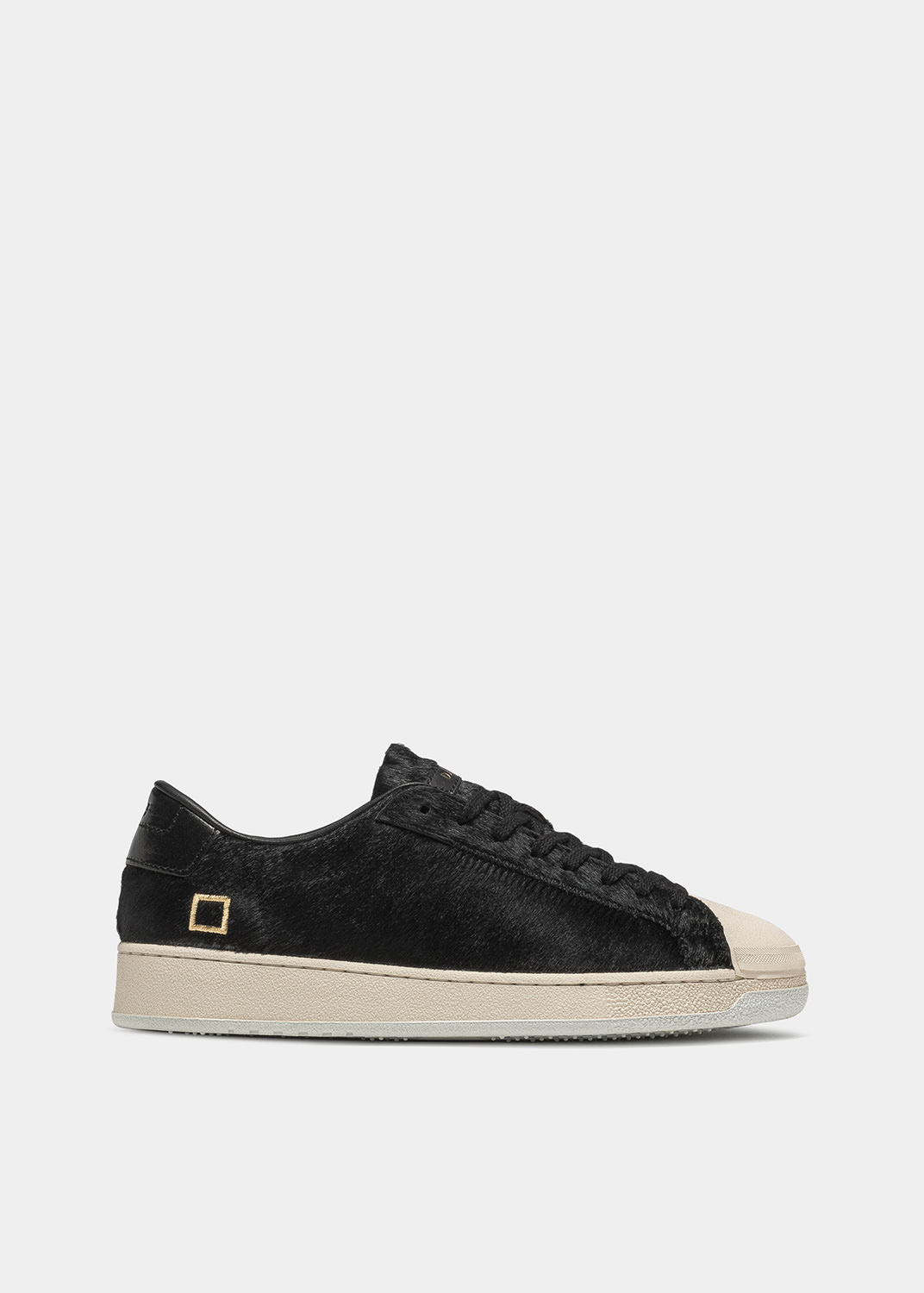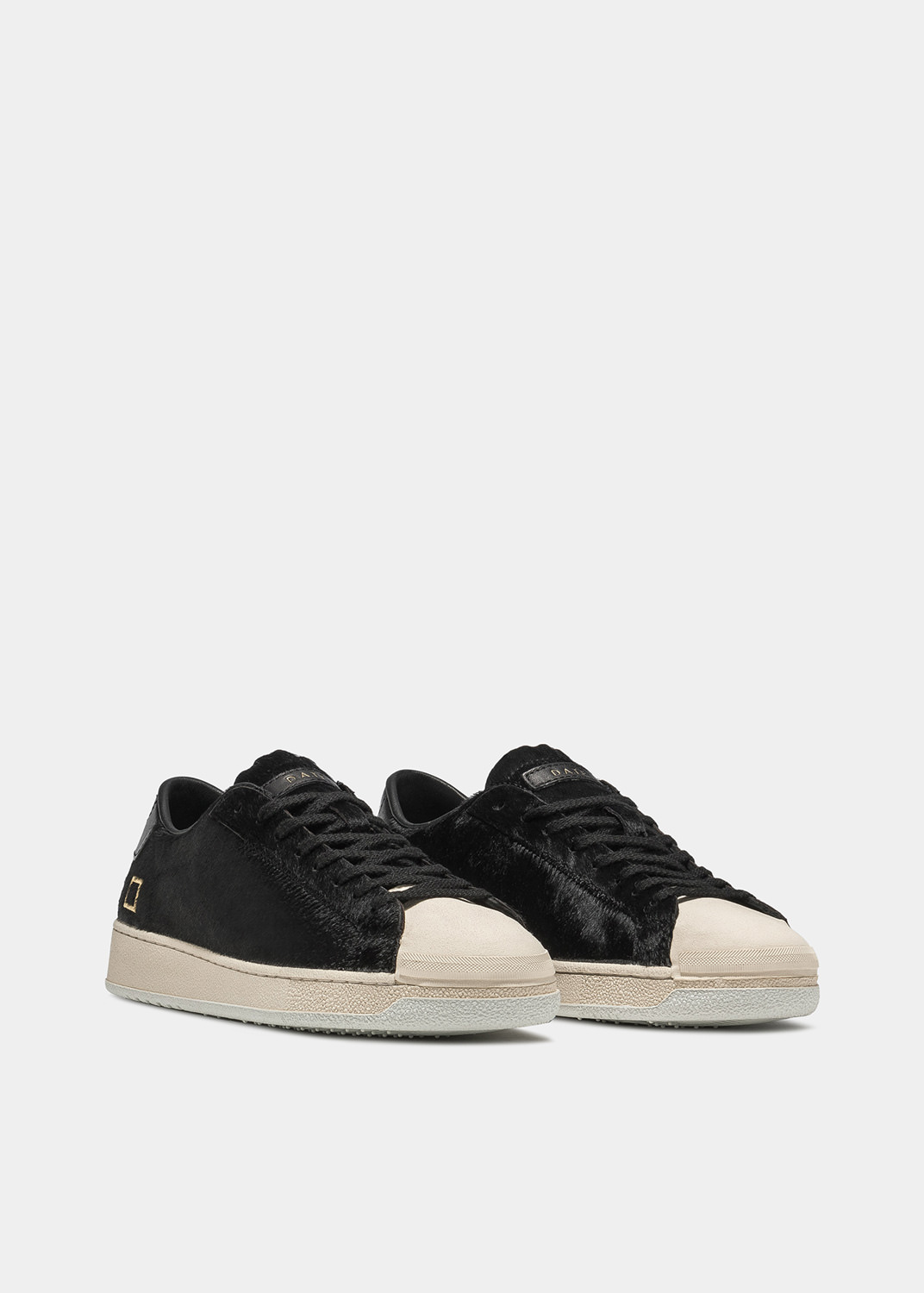 Sneaker bassa in cavallino colore nero. La punta è in gomma colore bianco crema. La linguetta, su cui è cucito il label D.A.T.E., è in cavallino. I lacci sono in cotone e il logo quadrato è ricamato lateralmente. Il talloncino posteriore su cui è impressa la cifra 2005 è in pelle colore nero. Fodera in pelle e spugna di cotone. La soletta interna è rialzata di 2.5 cm per un miglior comfort. La suola in gomma con texture cemento, alta 2 – 3 cm, è cucita. Tutti i materiali selezionati sono Made in Italy.