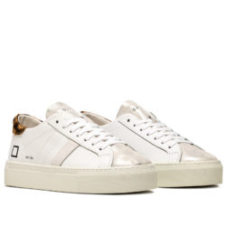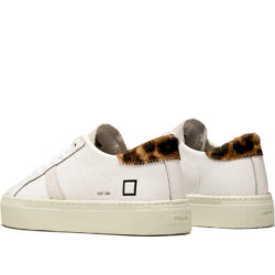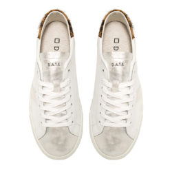 D.a.t.e. vertigo. Sneaker bassa in pelle colore bianco. La scritta D.A.T.E. è impressa sulla linguetta, in pelle con lamina parziale argento. La banda laterale è in nabuk colore bianco. I lacci sono in cotone e il logo quadrato e il codice sono stampato lateralmente. Il talloncino posteriore è in cavallino stampa leopard. Fodera in pelle e spugna di cotone. Il soletto interno è rialzato di 2.5 cm per un miglior comfort. La suola in gomma, alta 3.5 cm, è cucita. Tutti i tessuti e i pellami selezionati sono Made in Italy.