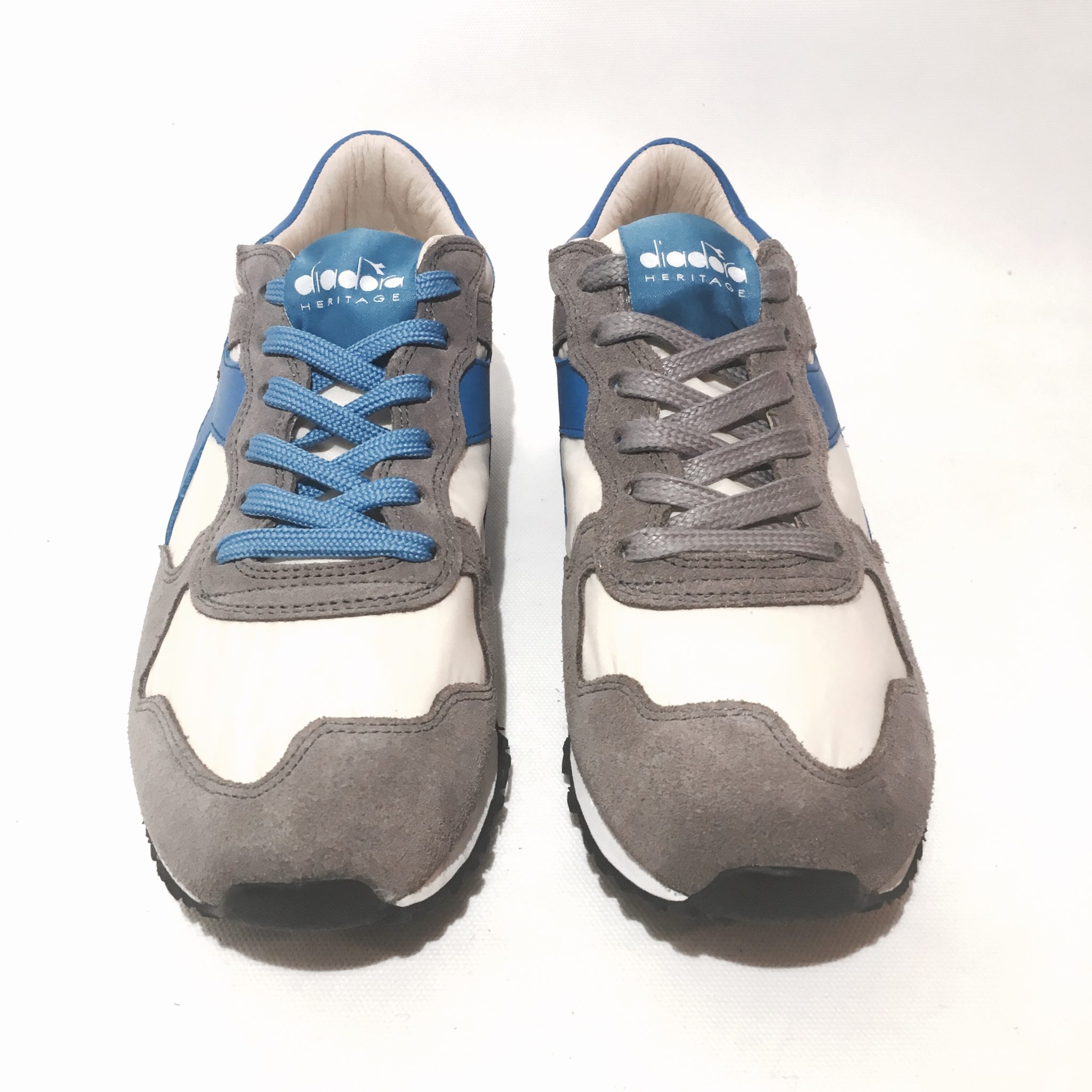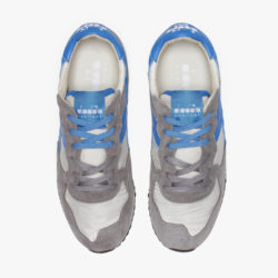 Diadora Heritage, ginnico in tela nylon burro e pelle scamosciata grey con dettagli in pelle azzurra, stinghe in doppio colore grey e azzurro .Plantare anatomico in pelle estraibile, fondo gomma.