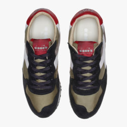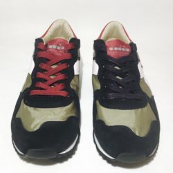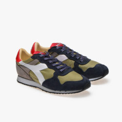 Diadora Heritage Trident, ginnico in nylon verde militare e pelle scamosciata blue e grey con dettagli in pelle bianca e rosso scuro, strighe in doppio colore blu e grey, plantare anatomico estraibile in pelle, fondo gomma.