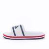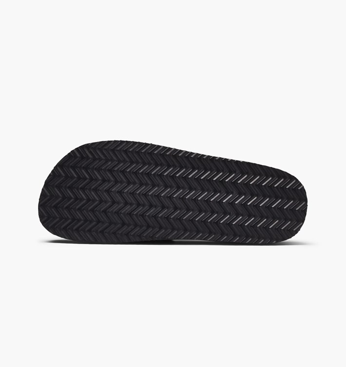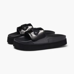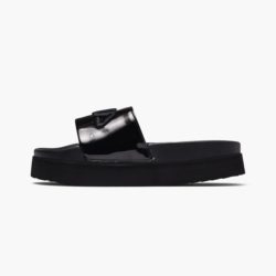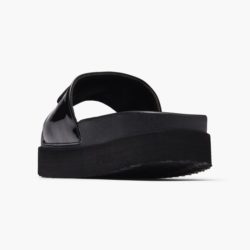 Fila slides in ecopelle nera con fascia logata in vernice. Zeppa platform 5 cm. Suola in gomma.