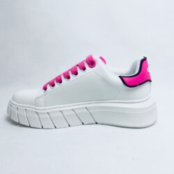Sneakers in ecopelle bianca e rifiniture rosa fluo, con plantare removibile, stringa rosa. tallone con logo nero, suola platform in gomma h cm 4