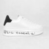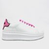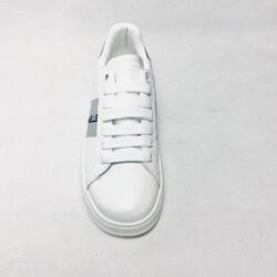 Sneakers in ecopelle bianca con banda laterale silver e logo nero, con plantare removibile, tallone silver con logo nero, suola platform in gomma bianca h cm 4