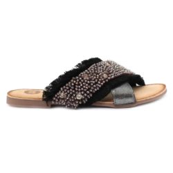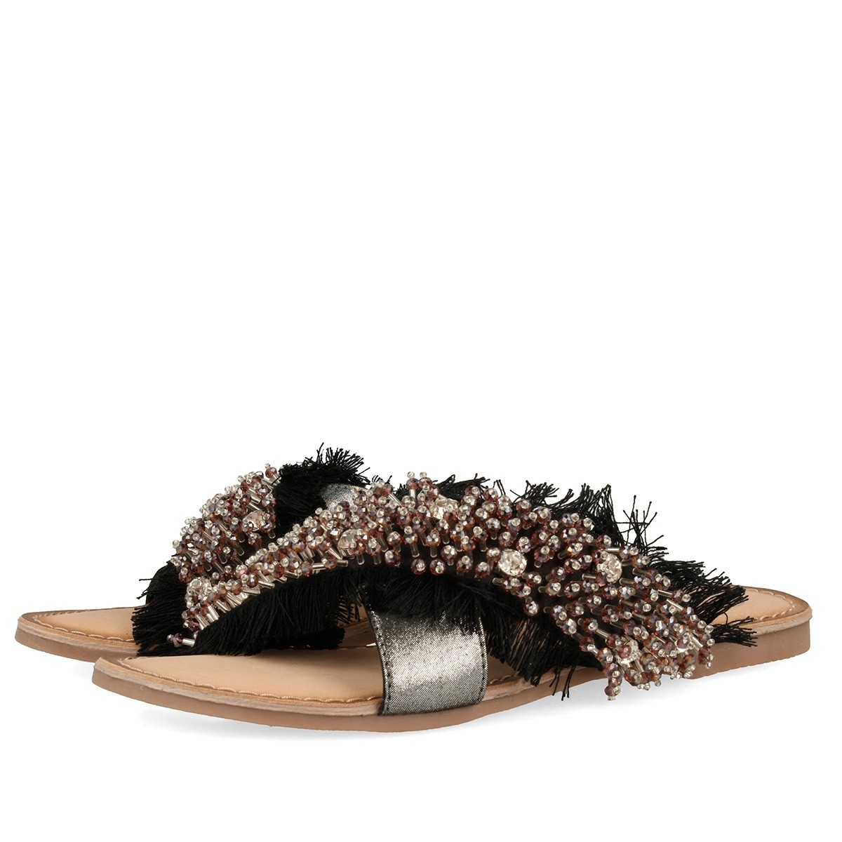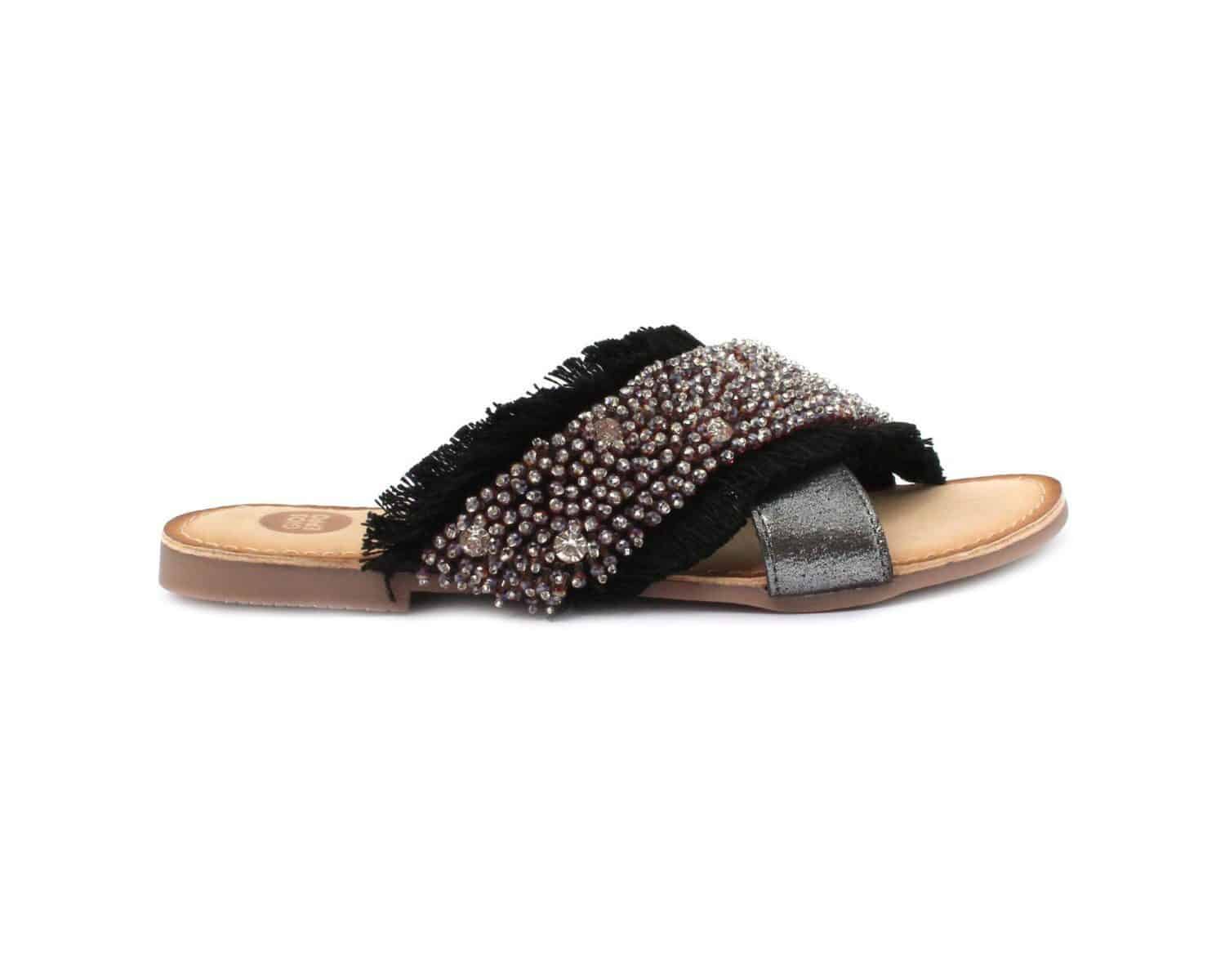 Gioseppo slides nera fascia a incrocio con frange e perline. Mod.45307