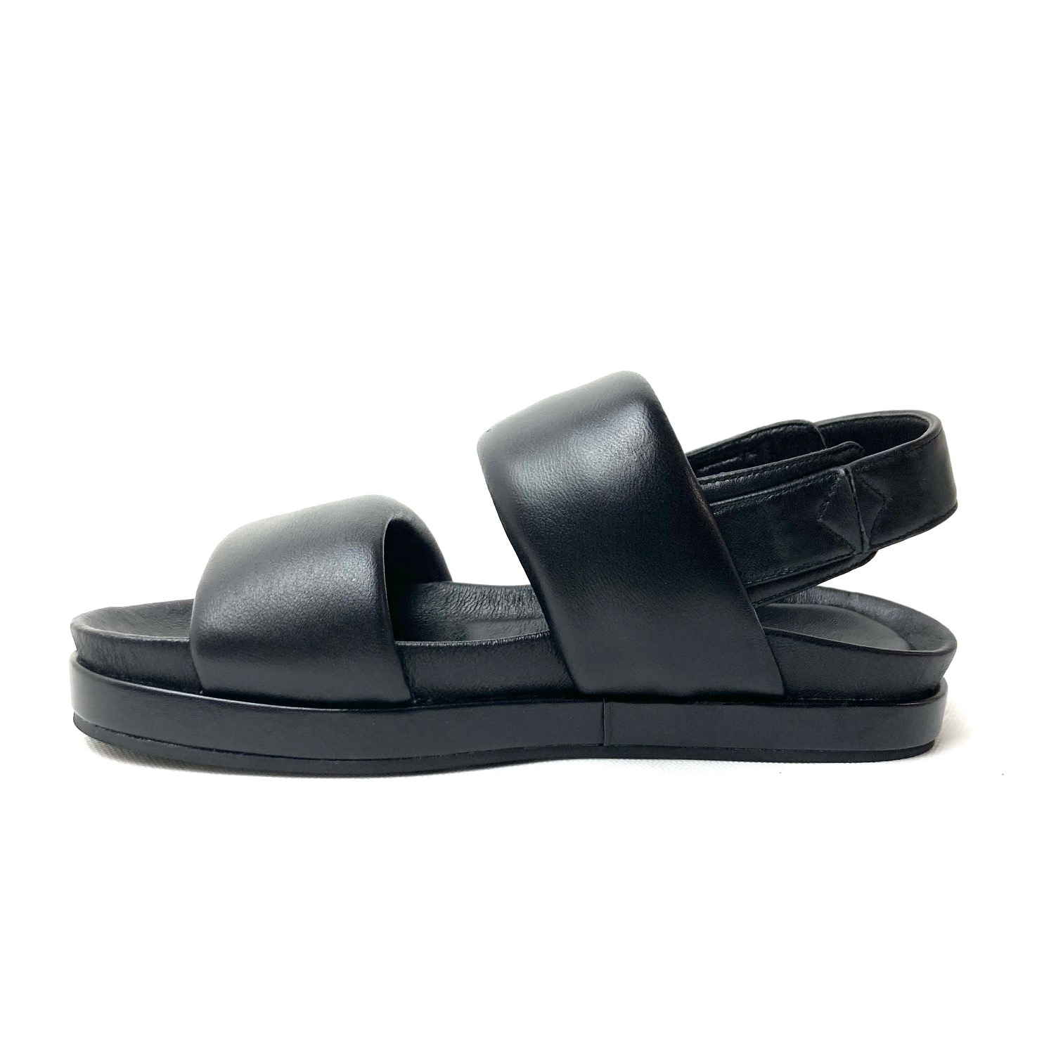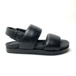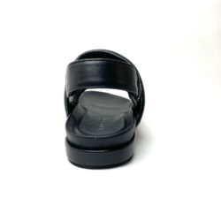 Sandalo con allacciatura senza fibbia chiusa da elastico, tomaia a doppia fascia imbottita in pelle nera. Suola con plantare fussbett foderato in pelle, suola in gomma cm 2,5