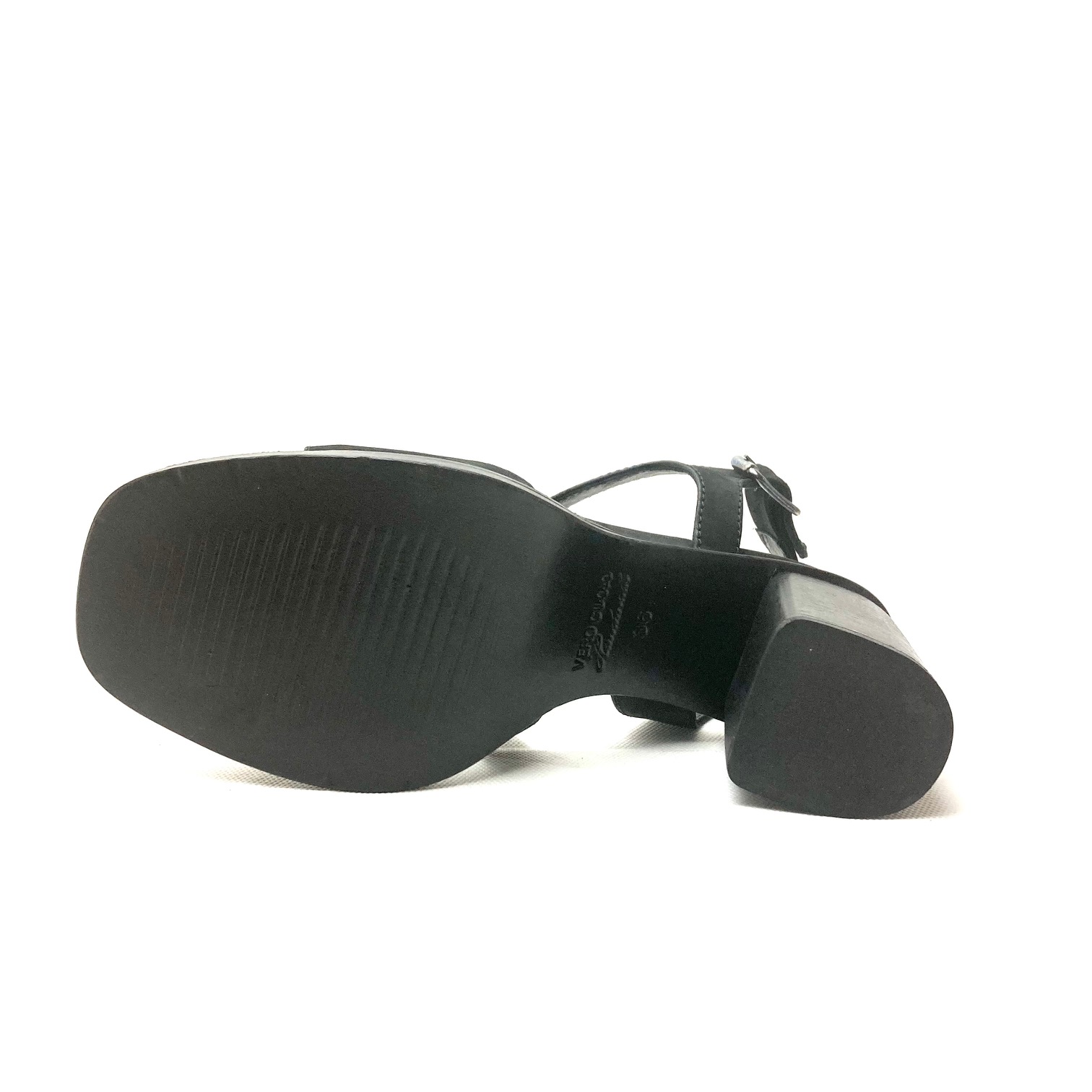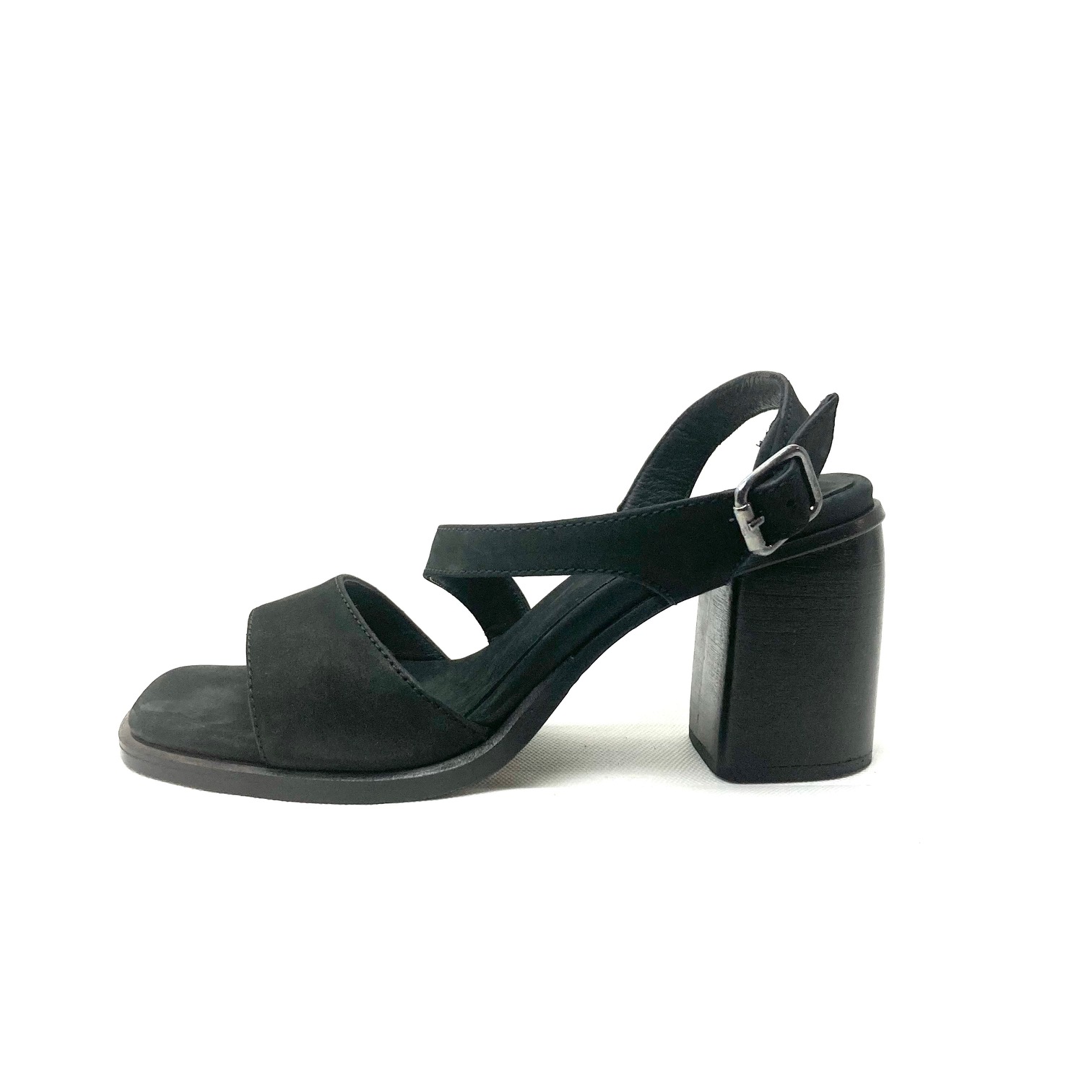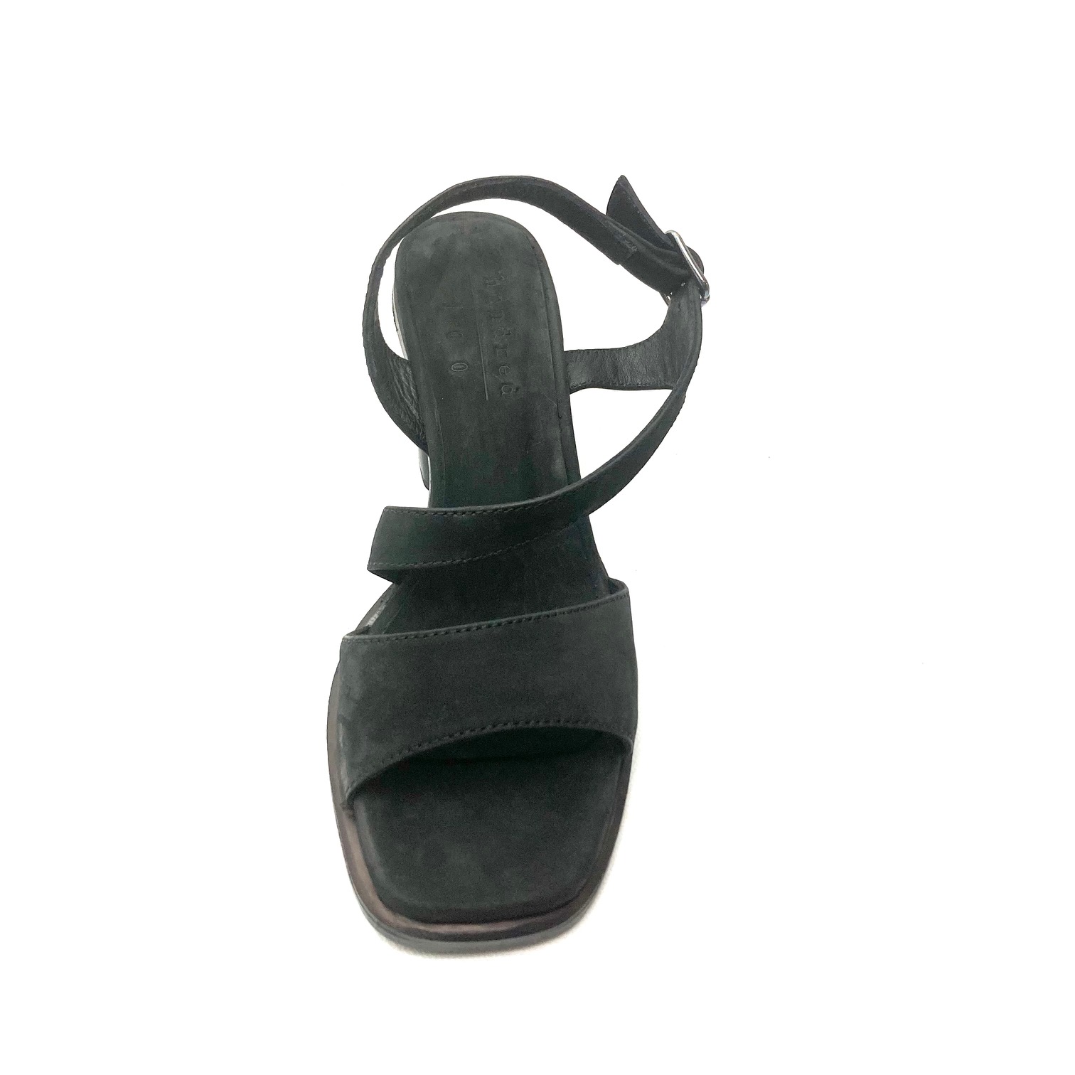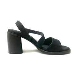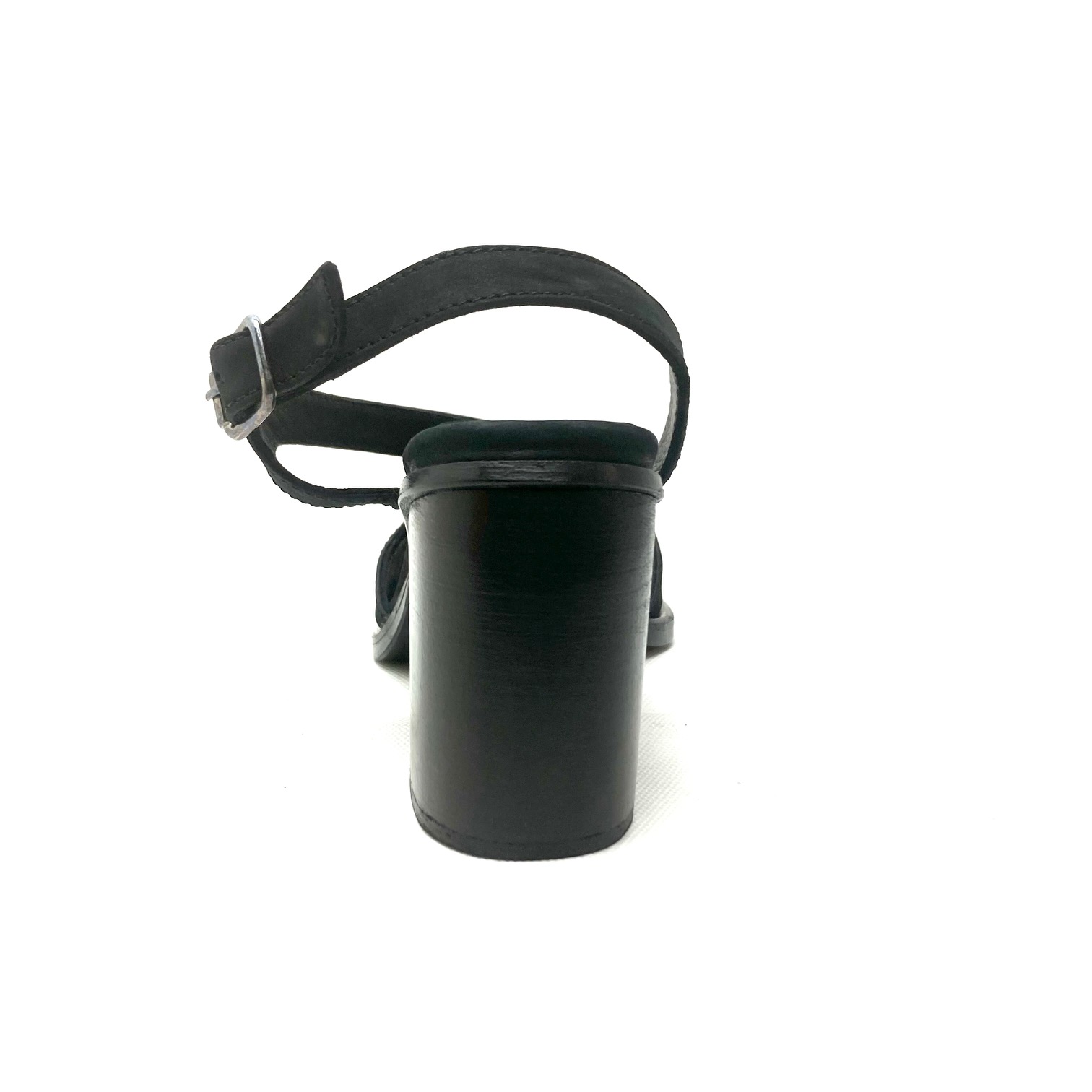 Sandalo in pelle nabuk black,chiusura con fibbia brunita, sottopiede memory in pelle, suola cuoio e tacco cm 7. 100% Made in Italy