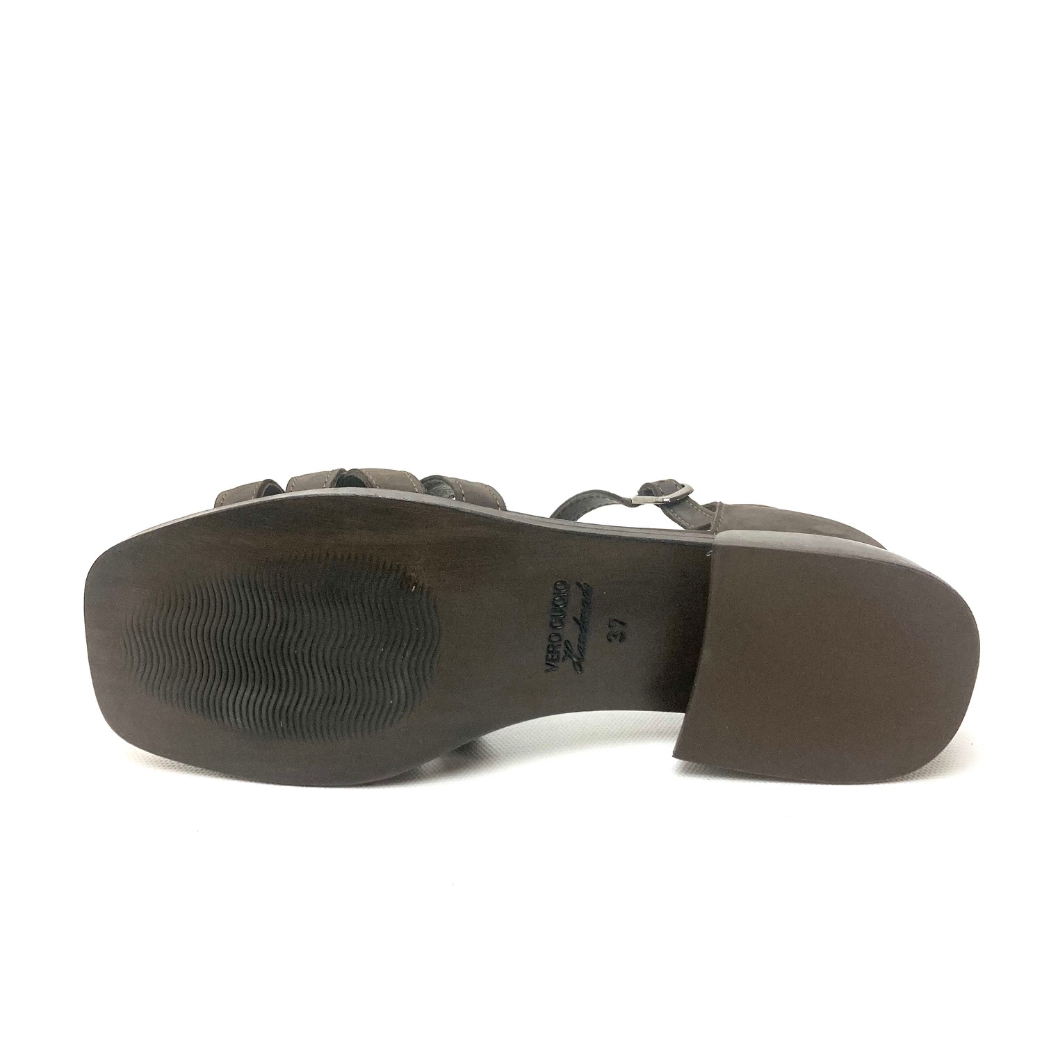 Sandalo in pelle nabuk testa di moro con tallone coperto ed allacciatura con fibbia brunita. Sottopiede in pelle con memory, suola in vero cuoio e tacco cm 3. 100%Made in Italy