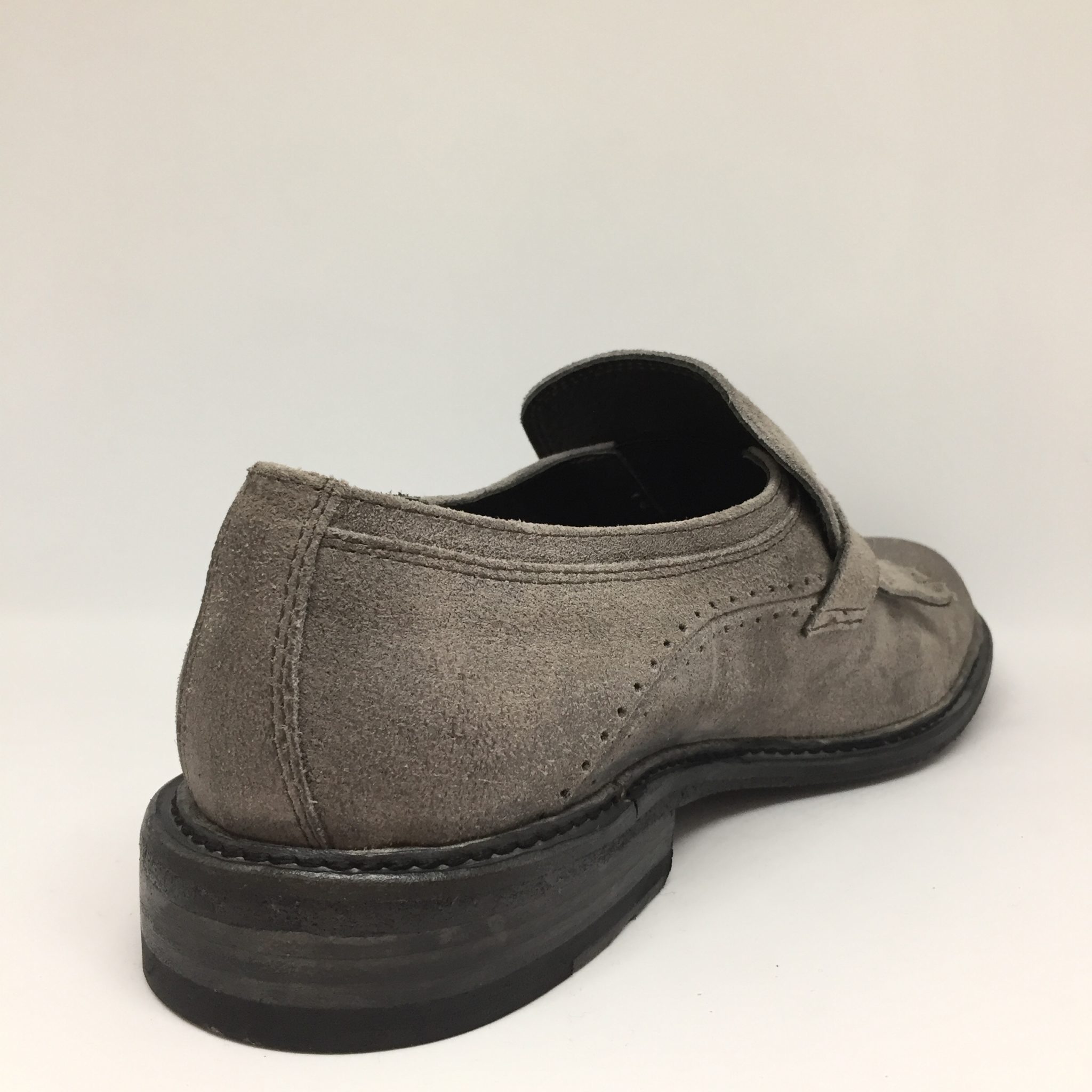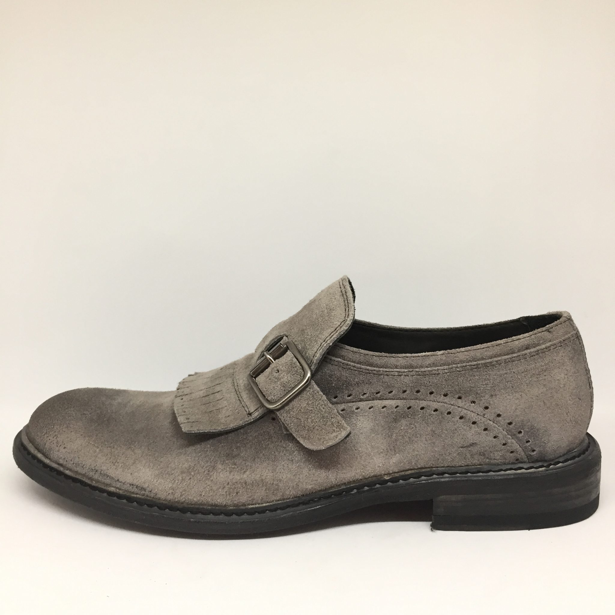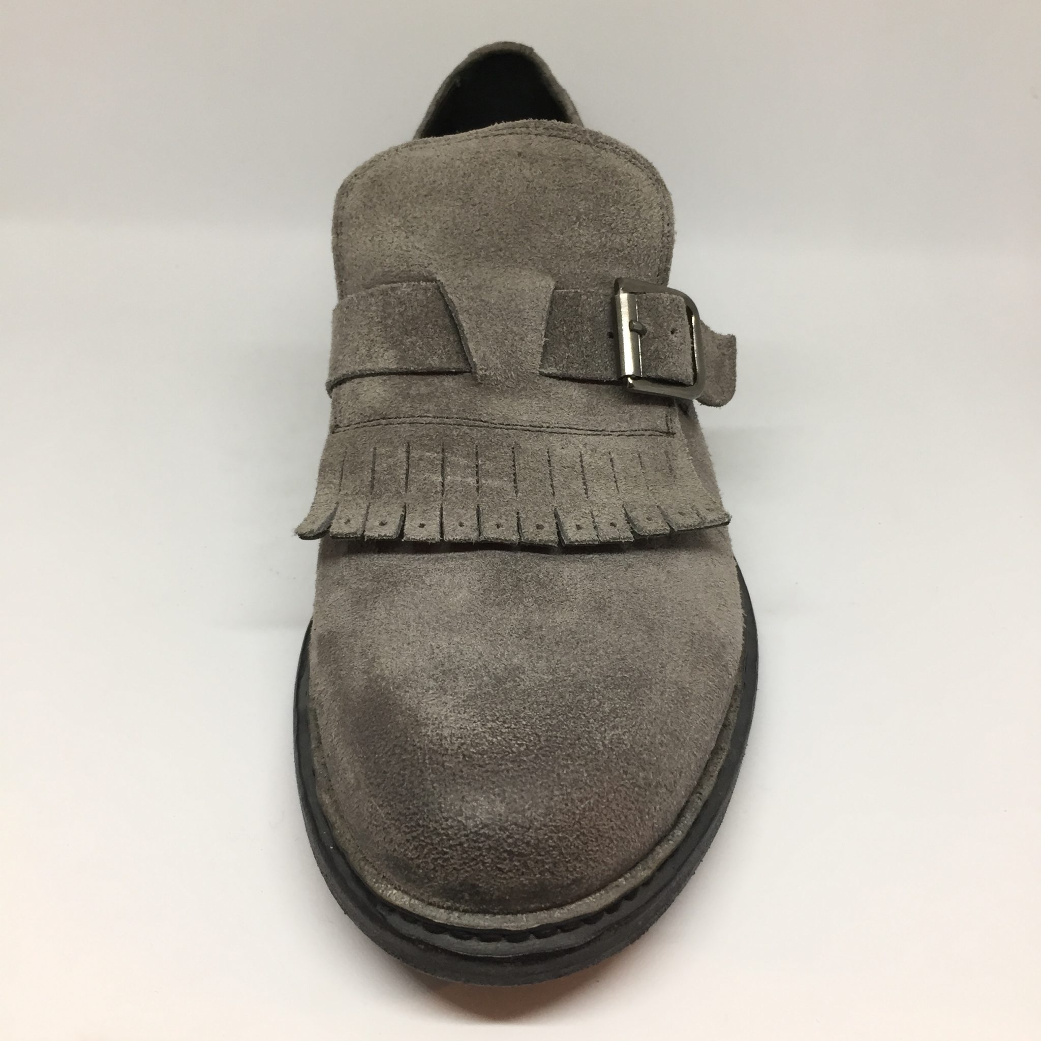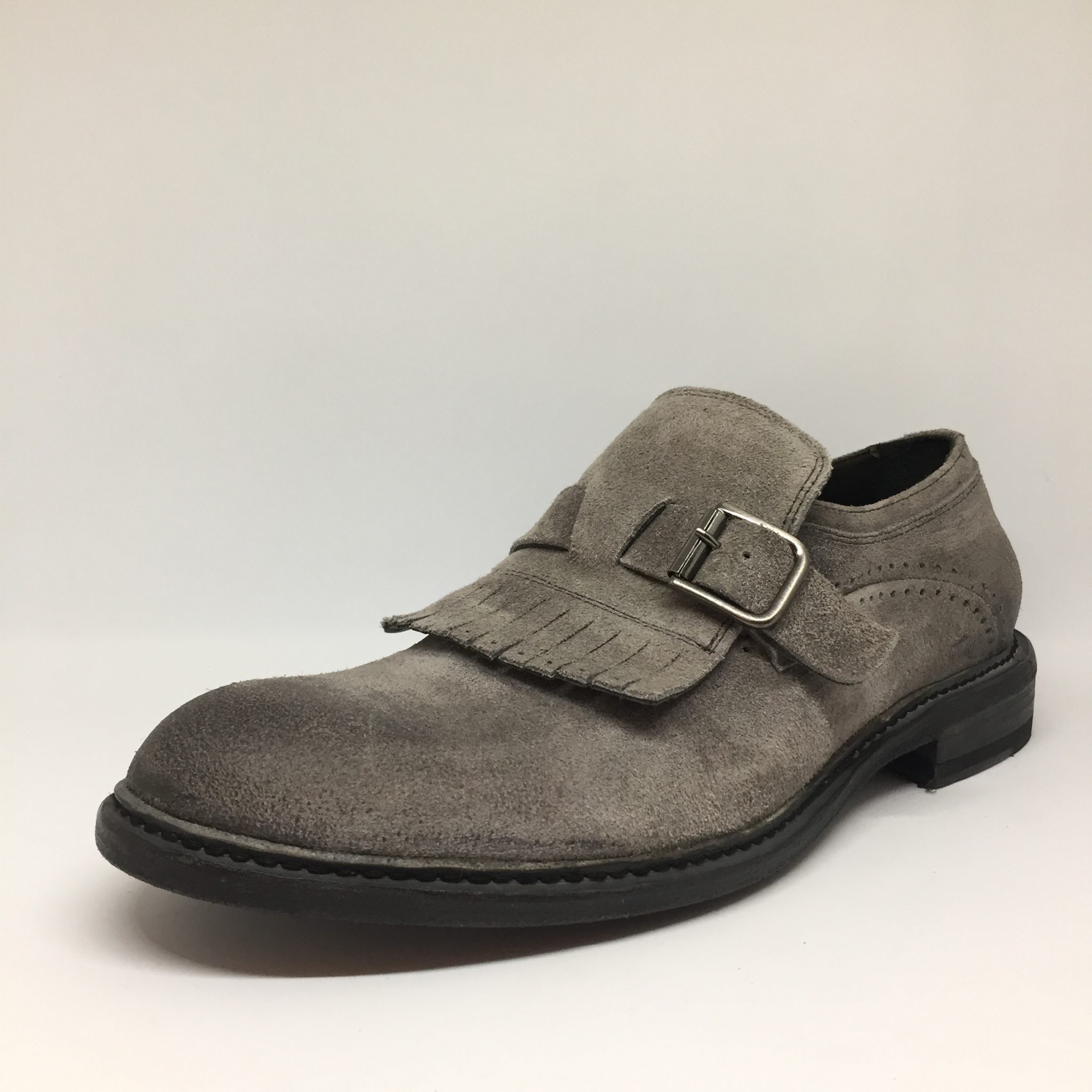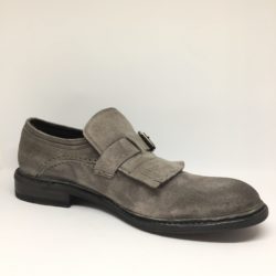 Mocassino uomo in suede color piombo. Allacciatura con fibbia e dettaglio frange. Fondo cuoio. Calzata abbondante. Made in Italy