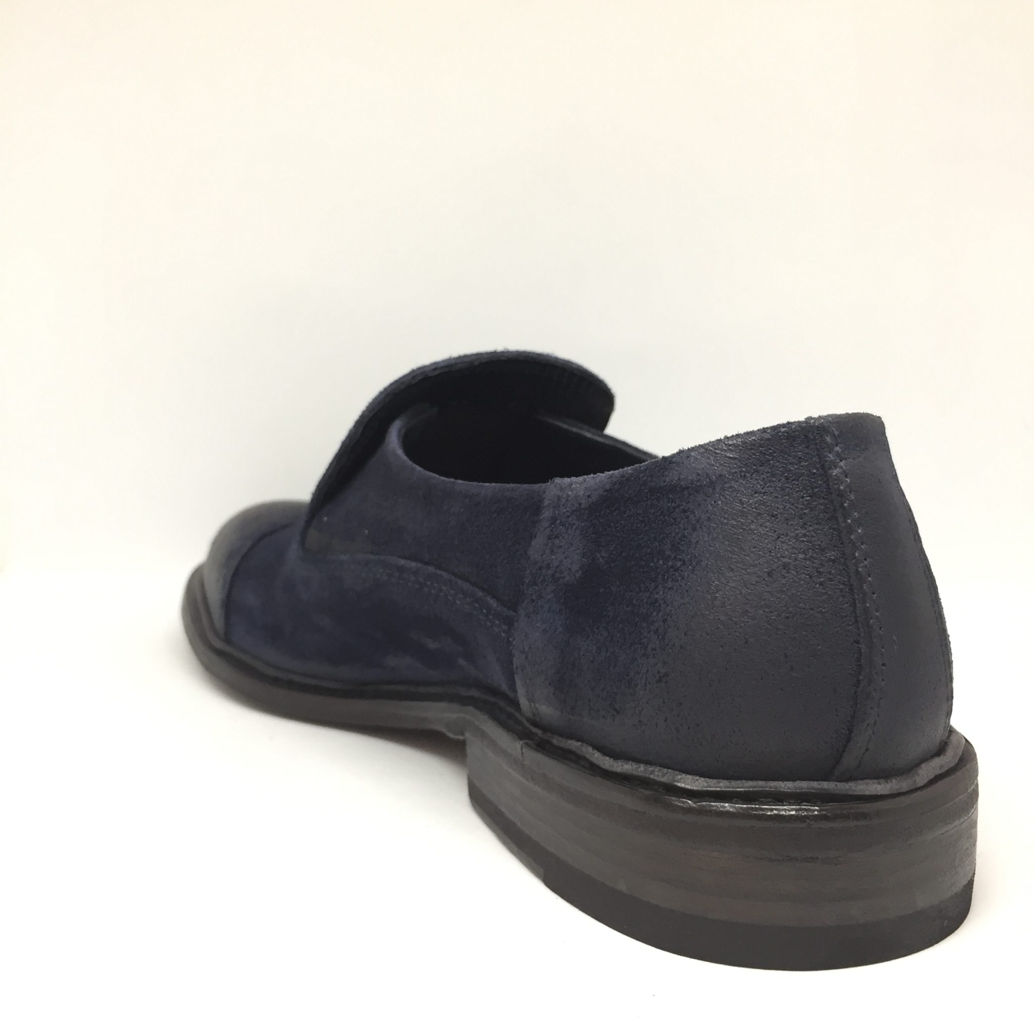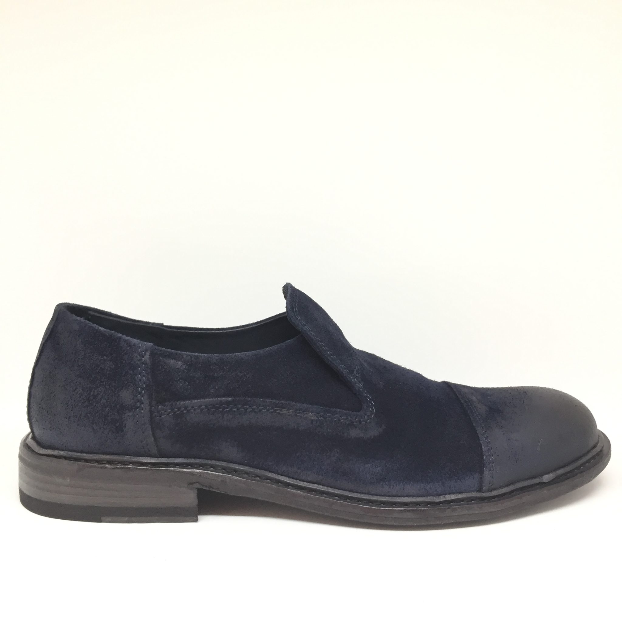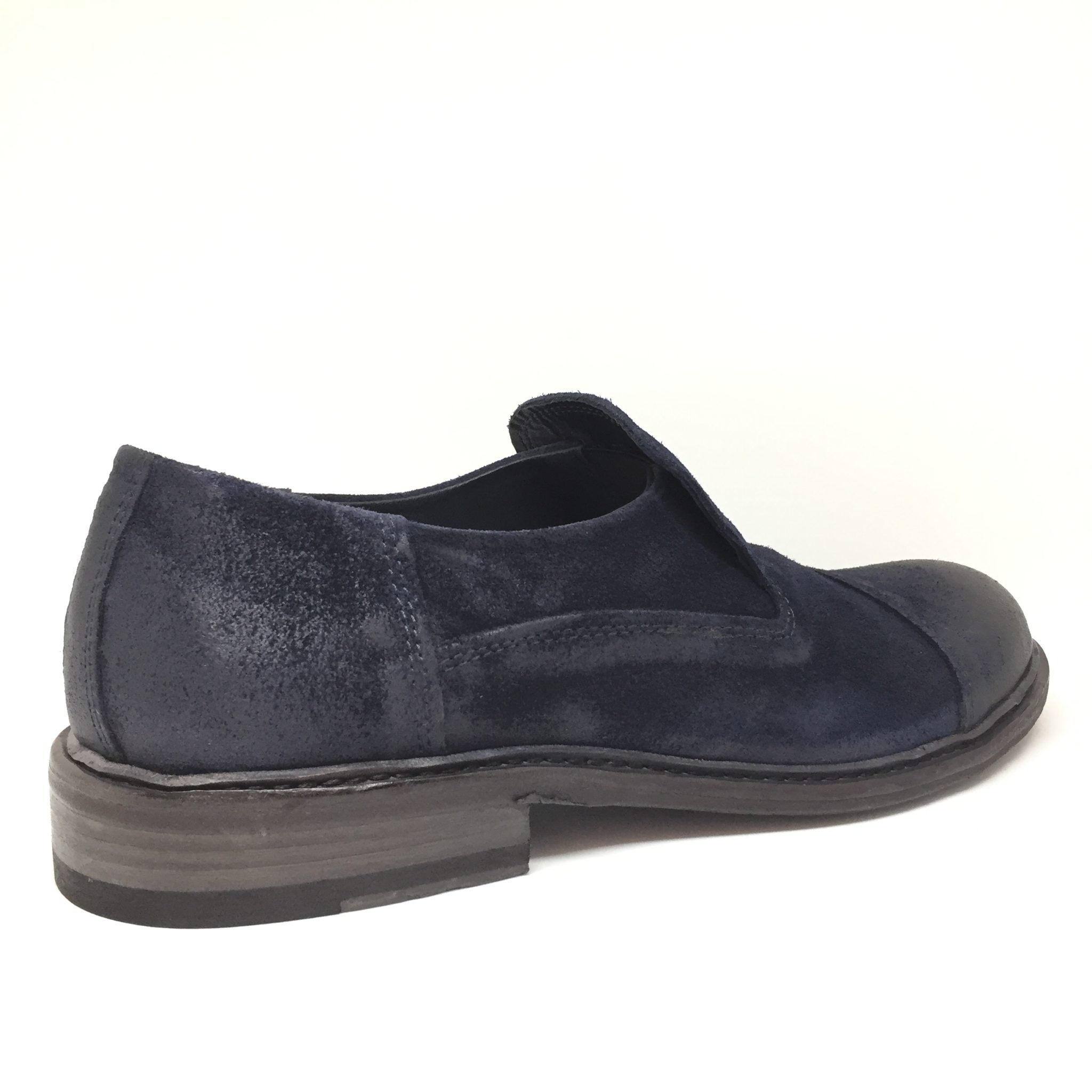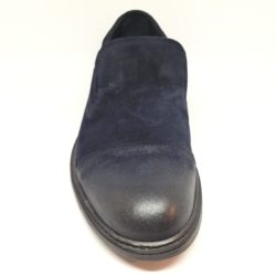 Slip on uomo in suede blu, elastico laterale. Fondo cuoio. Calzata abbondante. Made in Italy.