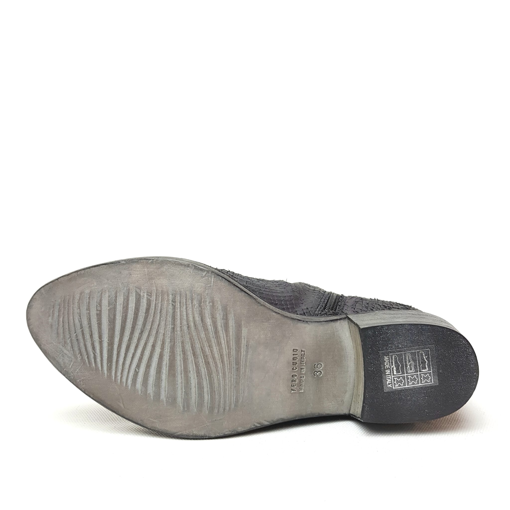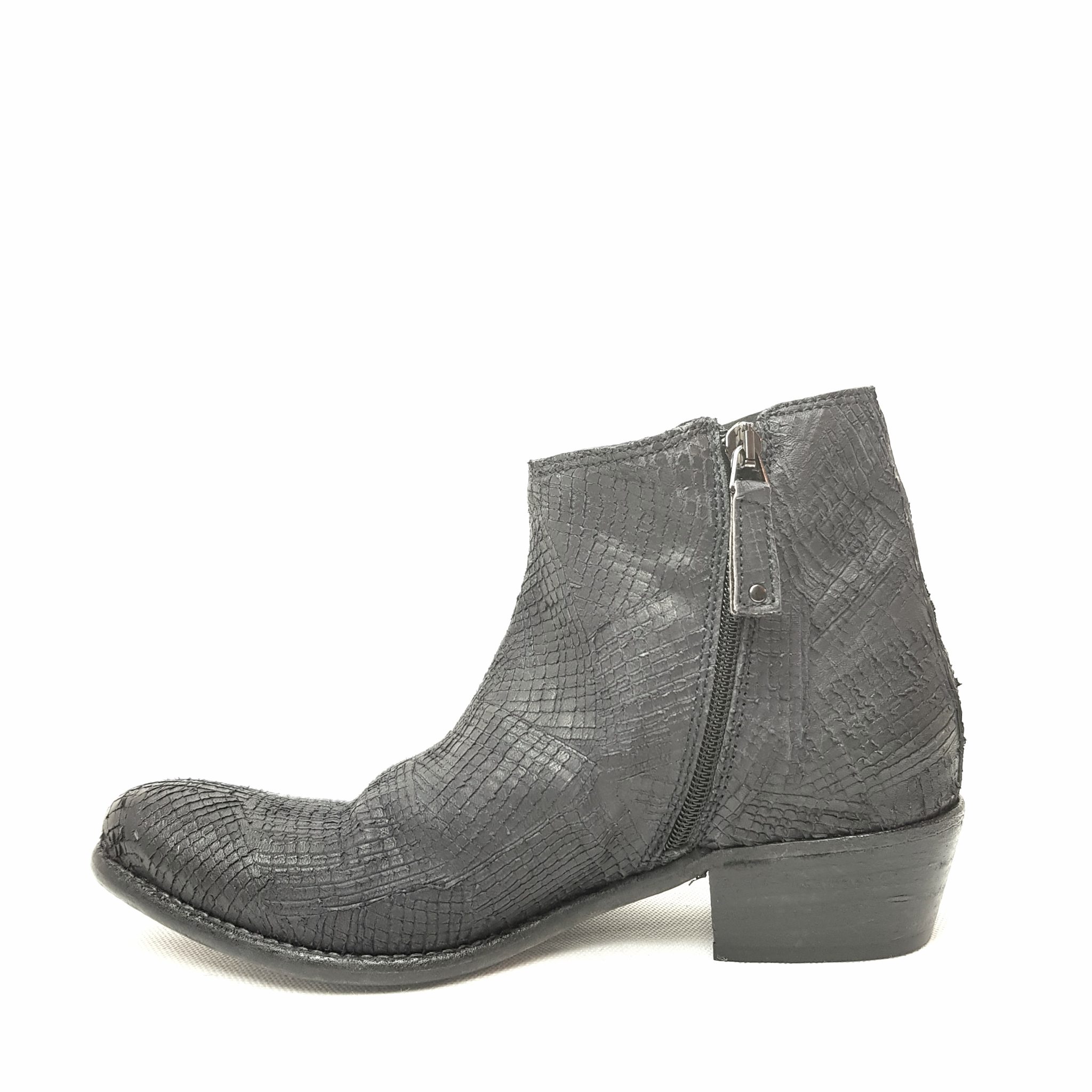Texano in vera pelle effetto squamato. Fondo cuoio. Zip laterale. Altezza tacco 3 cm.
