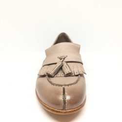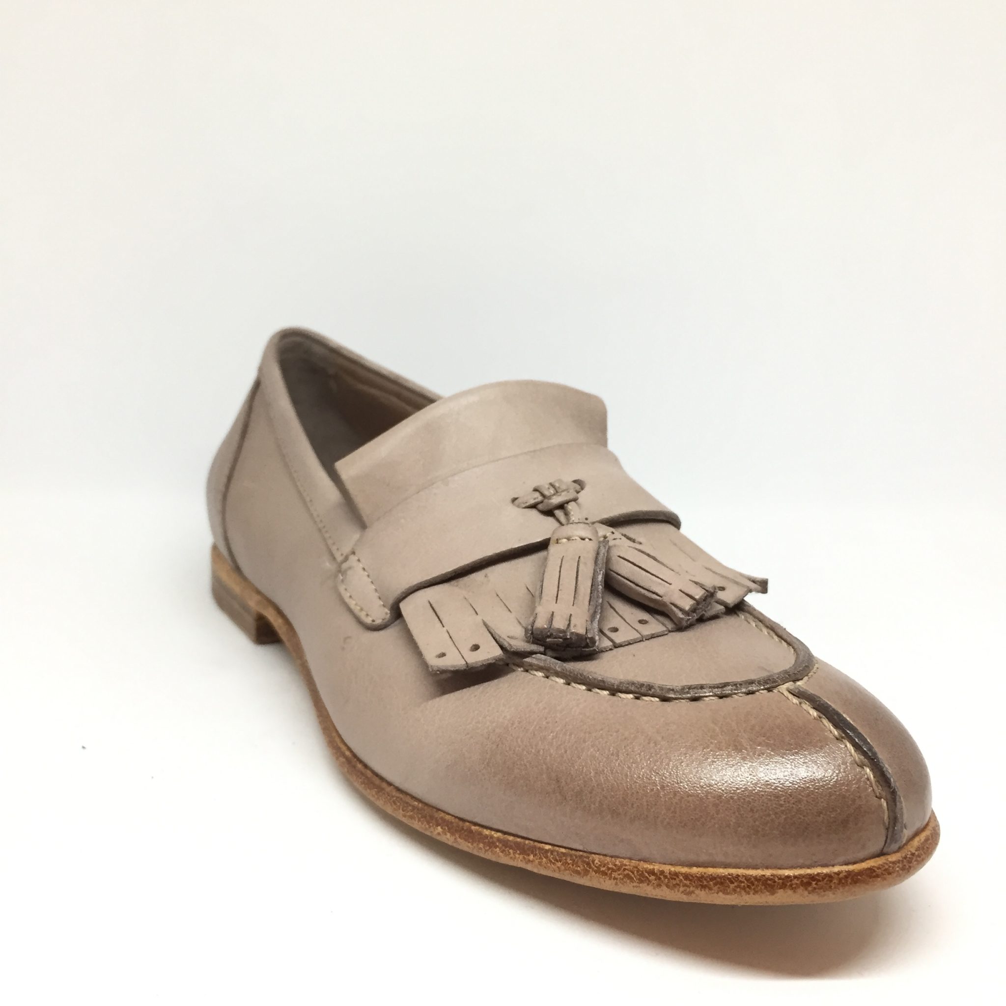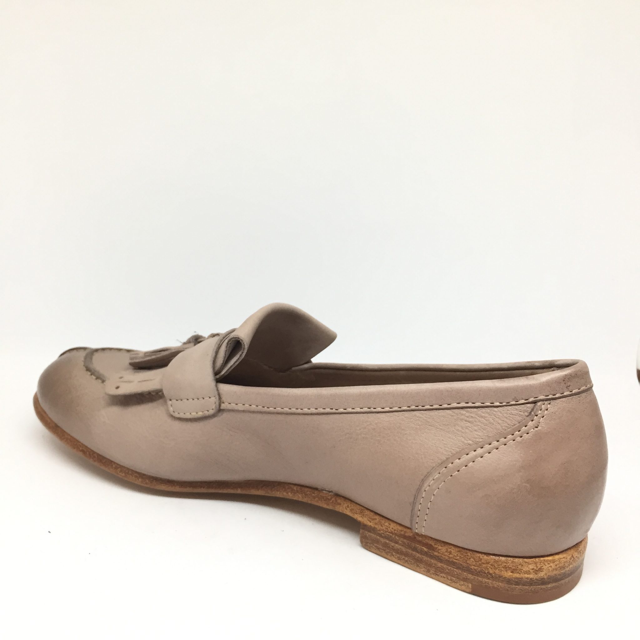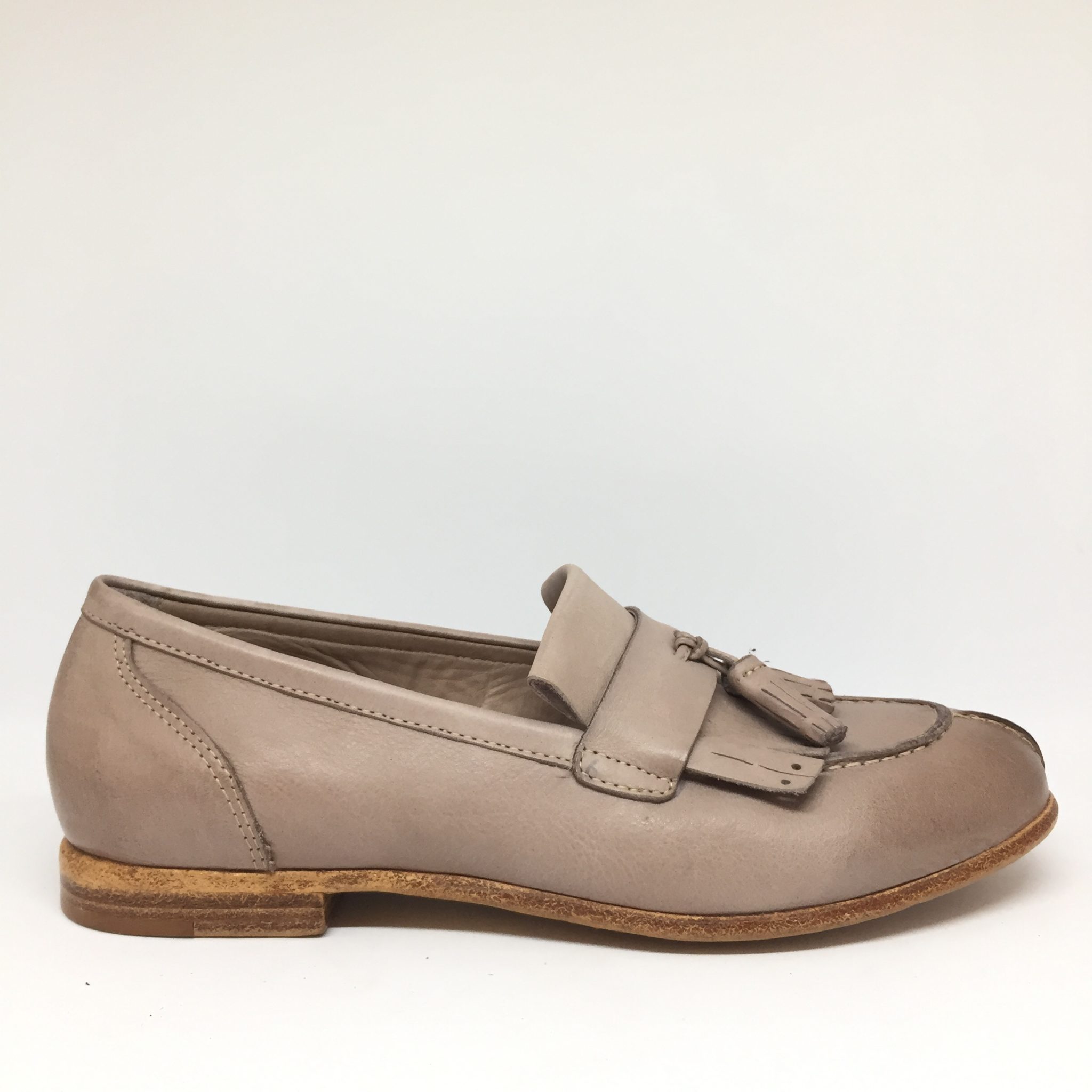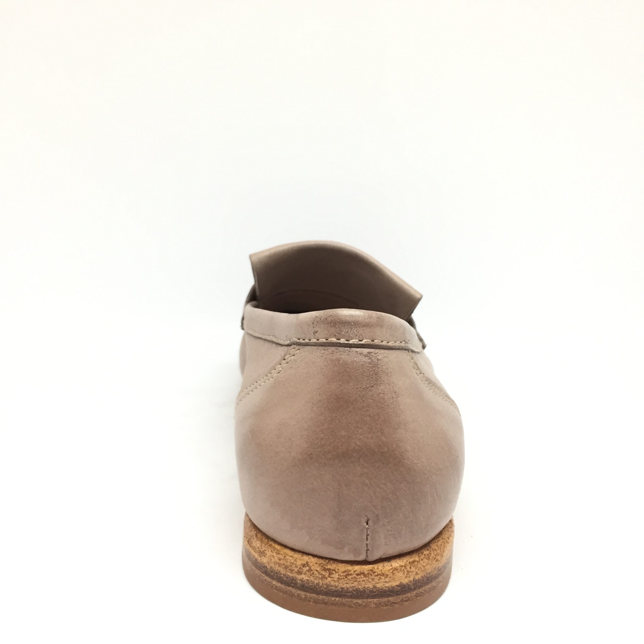 Mocassino in pelle color sabbia con nappine sul moresetto. Fondo cuoio. Made in Italy.