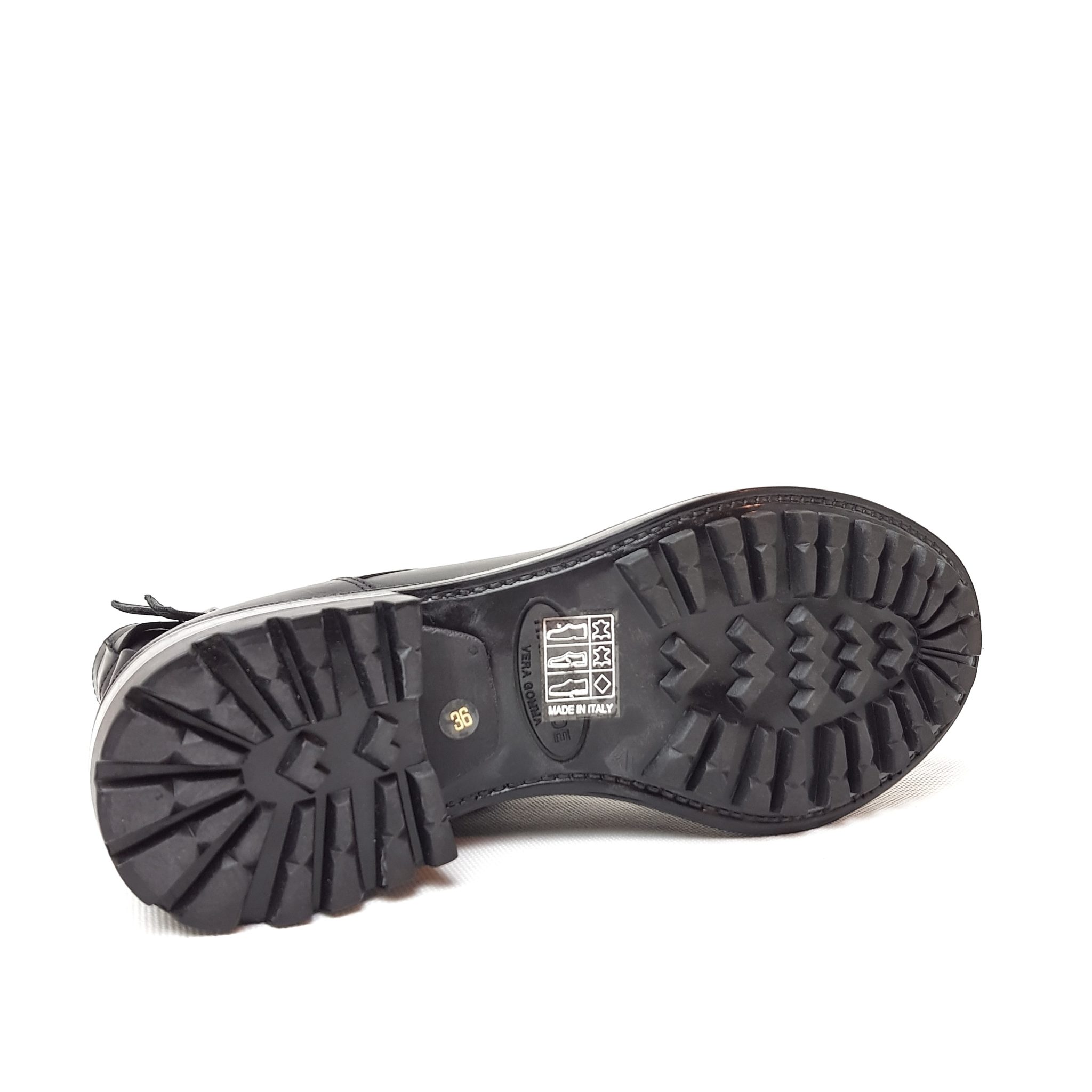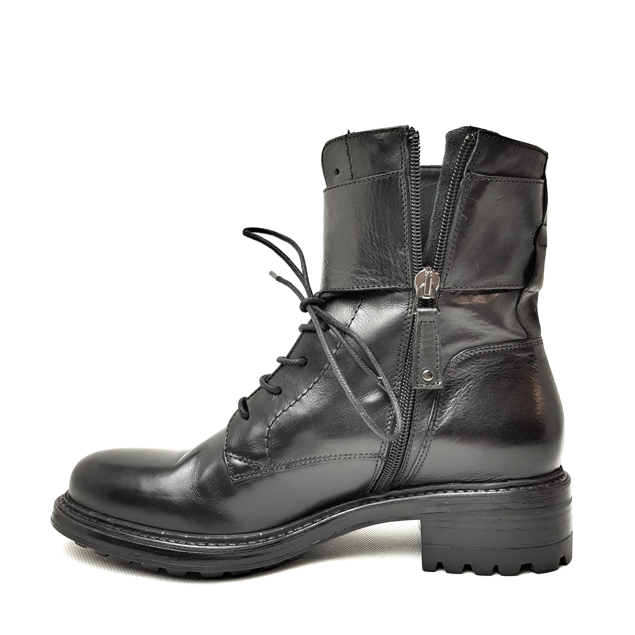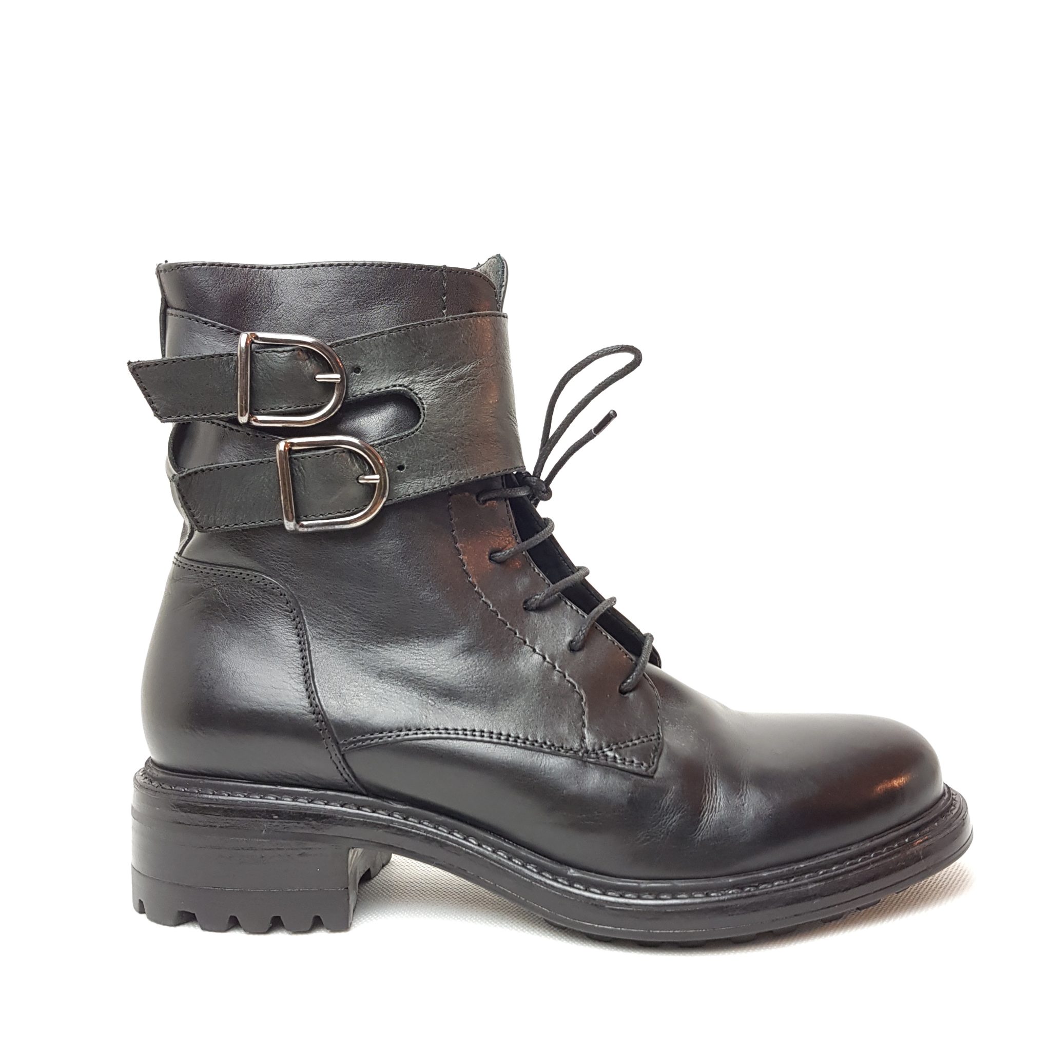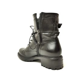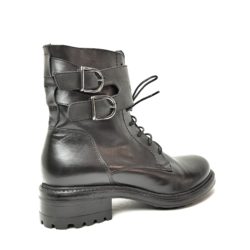Hundred100 anfibio in pelle nero. Allacciatura con stringhe, fibbie e zip laterale. Fondo gomma. Tacco 3,5 cm