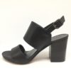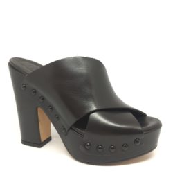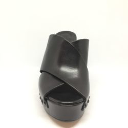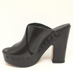 Zoccolo in pelle nera con fascia a incrocio e profilo borchiato. Tacco in legno 11 cm, plateau 3 cm. Fondo cuoio-gomma. Made in Italy