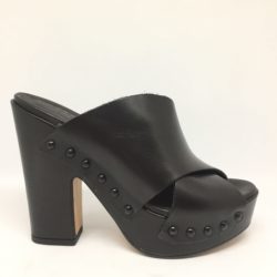 Zoccolo in pelle nera con fascia a incrocio e profilo borchiato. Tacco in legno 11 cm, plateau 3 cm. Fondo cuoio-gomma. Made in Italy