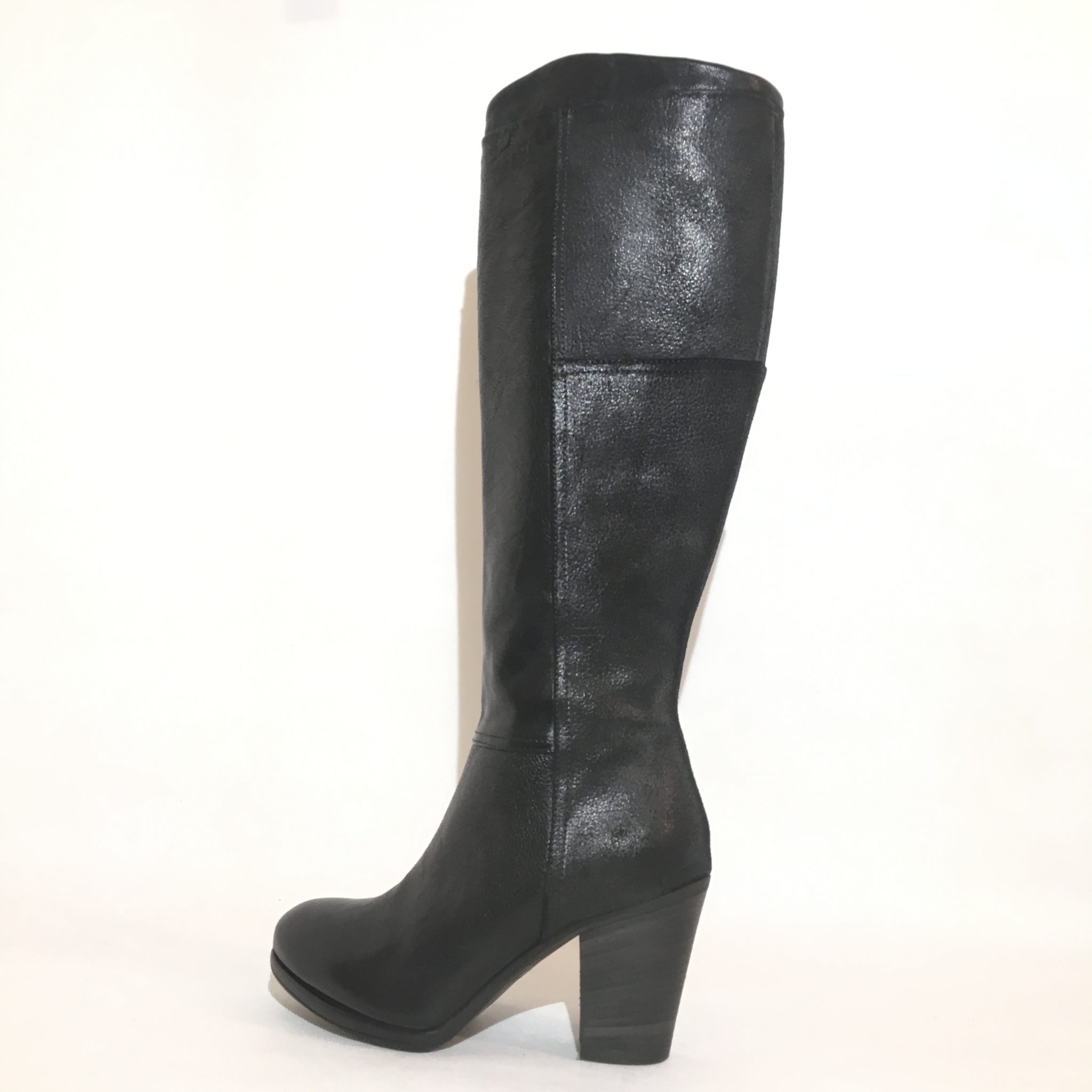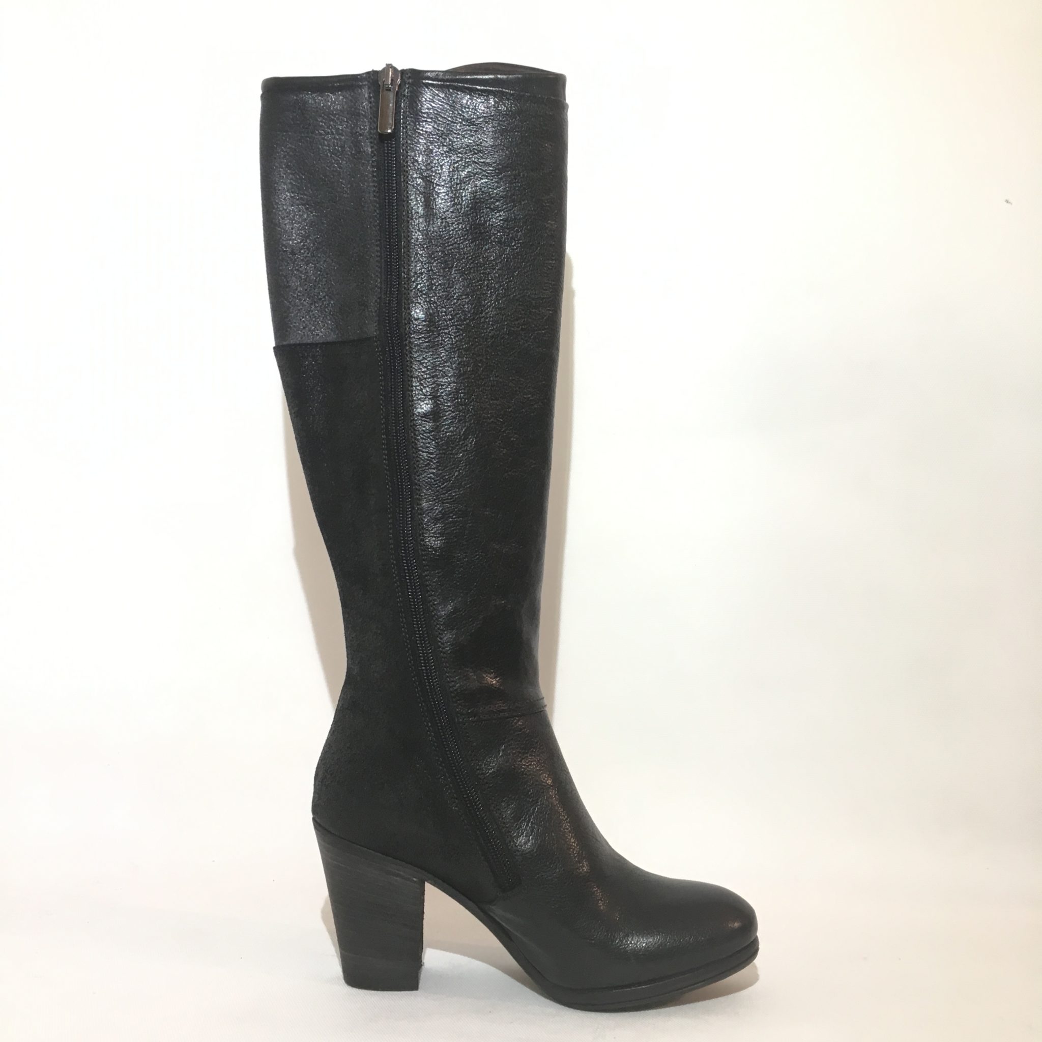 Sivale in pelle nera, sul retro pellame craccato. Zip laterale. Fondo gomma/cuoio. Tacco 7 cm. Made in Italy