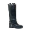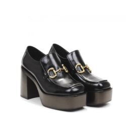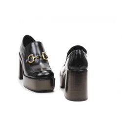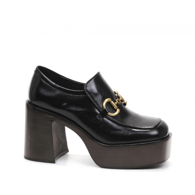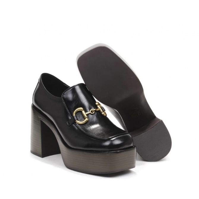 Mocassino con forma squadrata in pelle spazzolata nera, accessorio gold,fodera pelle. Suola effetto legno t.moro con plateau cm 4.5 tacco cm 10, fondo gomma.