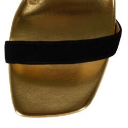 Sandalo in suede nero a più vie con tacco “nascosto”, forma squadrata, tomaia imbottita in pelle oro , tacco nascosto in metallo oro cm.10
