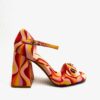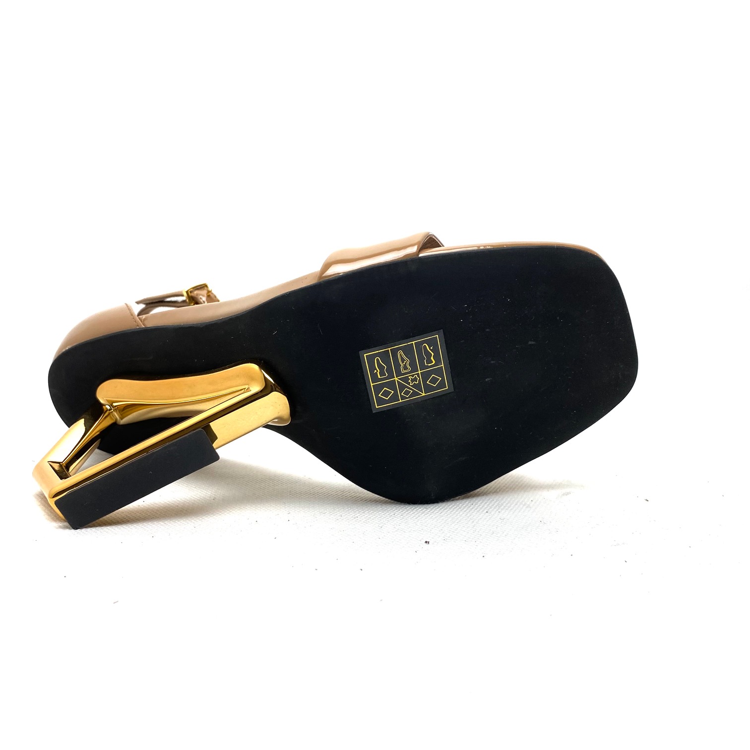 Sandalo in eco-naplack beige forma squadrata e tacco in oro con forma geometrica h cm 10