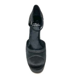 Scarpa modello ankle strap in velluto nero con profili in nero lurex, fodera pelle e tessuto, forma arrotondata, plateau cm 3,7, tacco cm 12, suola in gomma.