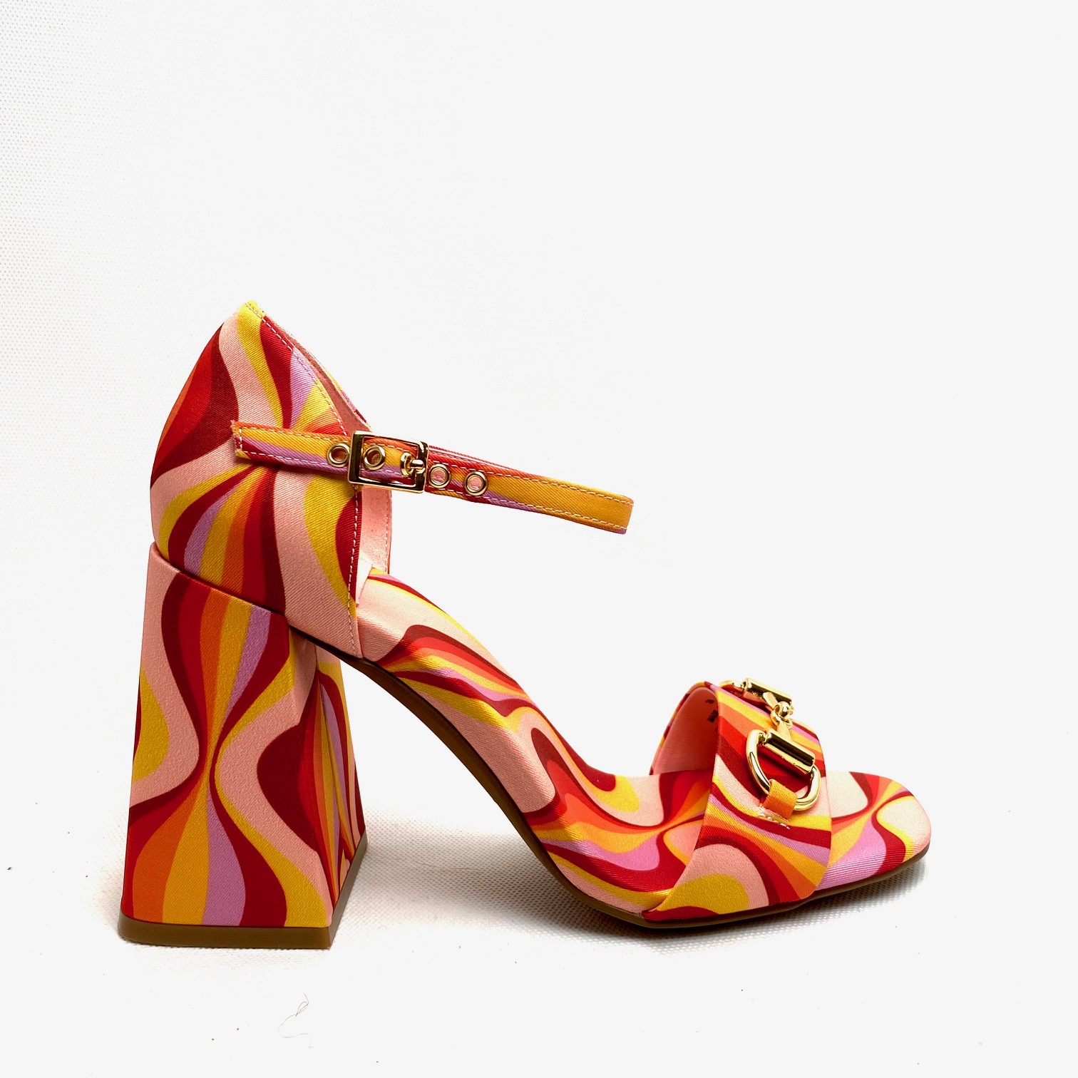 Sandalo in tessuto multicolor rosa rosso arancio giallo e viola