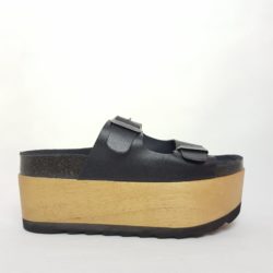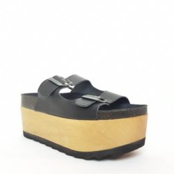 Sandalo a ciabatta doppia fascia in pelle nera. Platform in legno 8 cm. Fondo gomma.