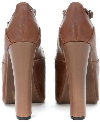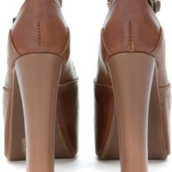 Sandalo in pelle marrone con tacco in legno. Altezza 12 cm. Plateau 5 cm.