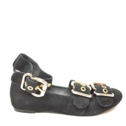 Ballerina in suede nera. Doppia fibbia regolabile in metallo dorato. Laccio alla caviglia removibile. Fondo gomma. Sottopiede imbottito.