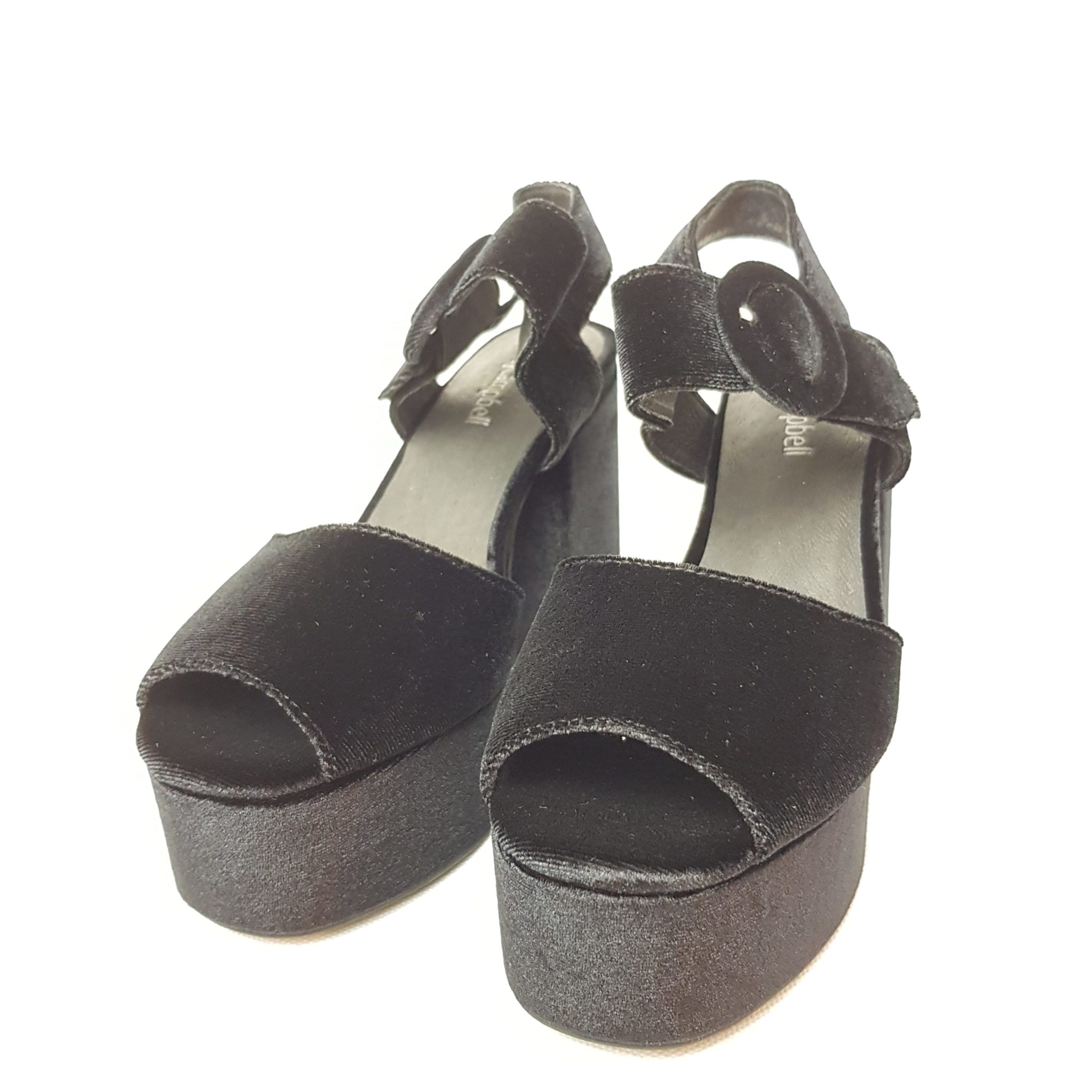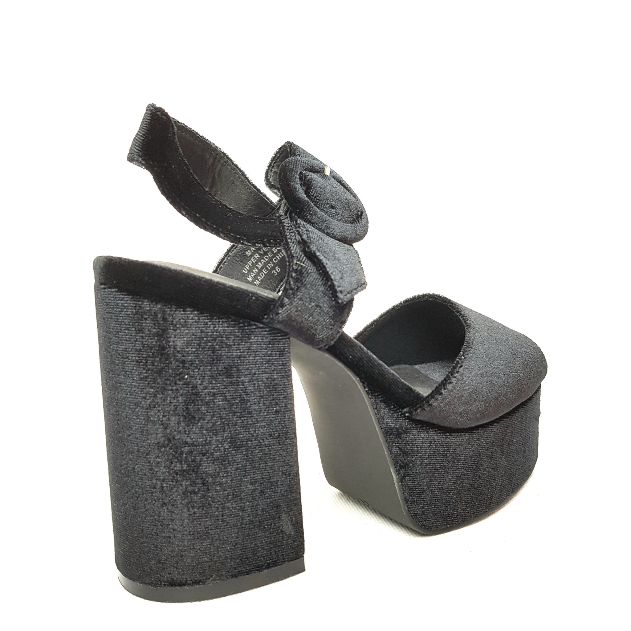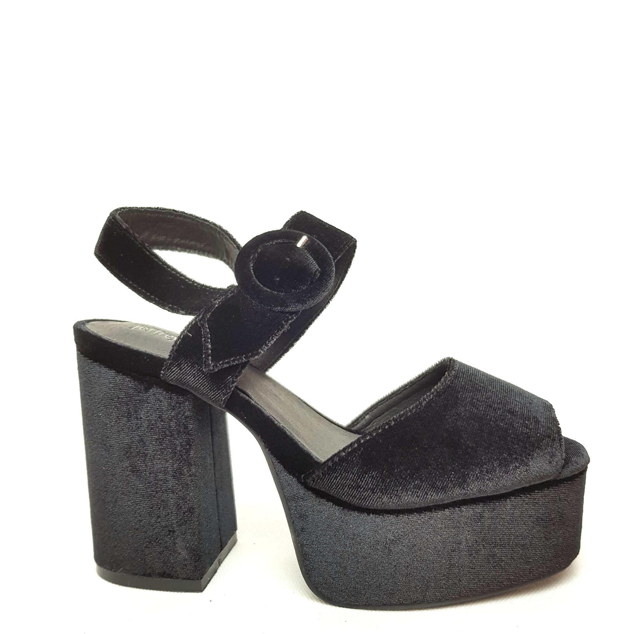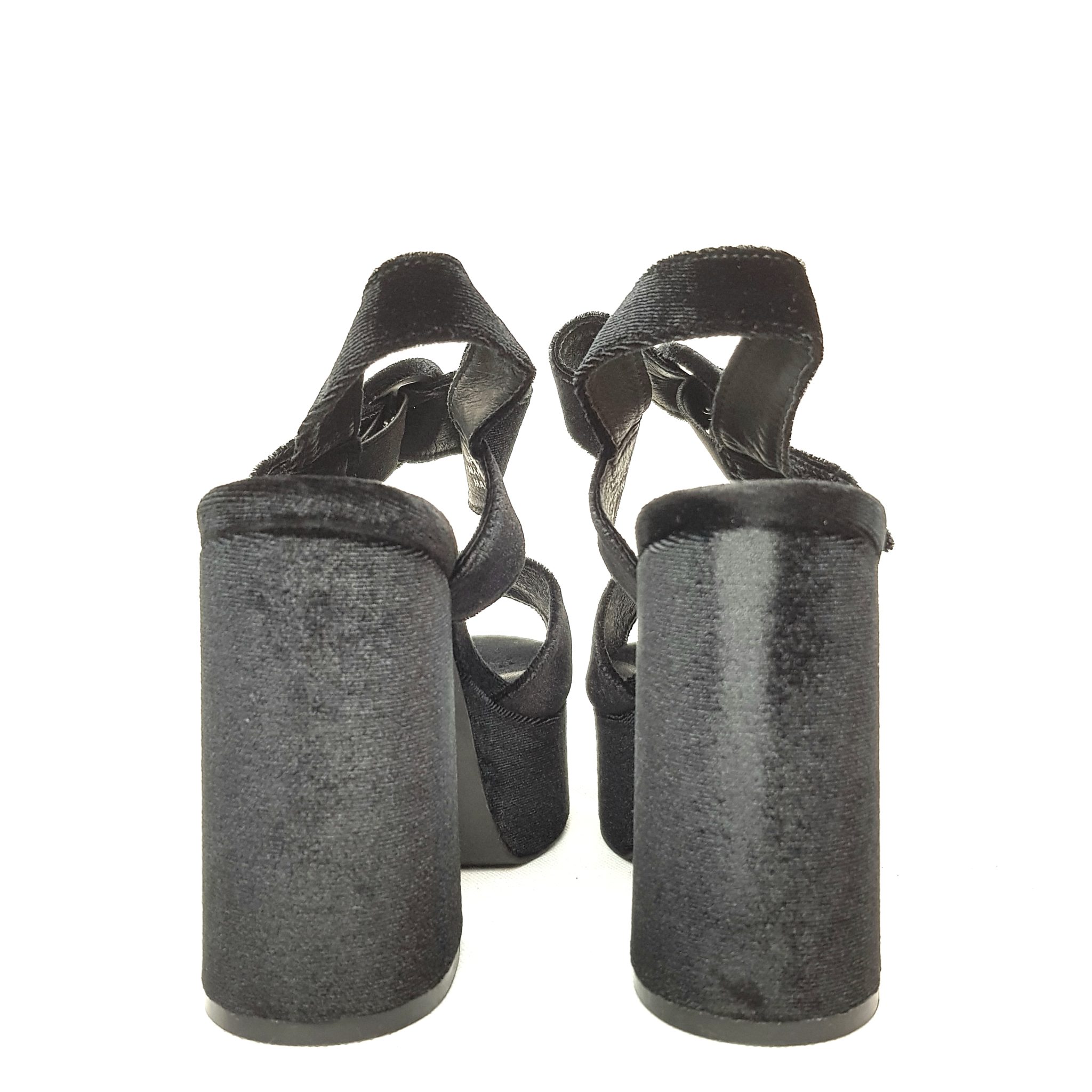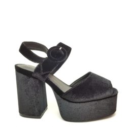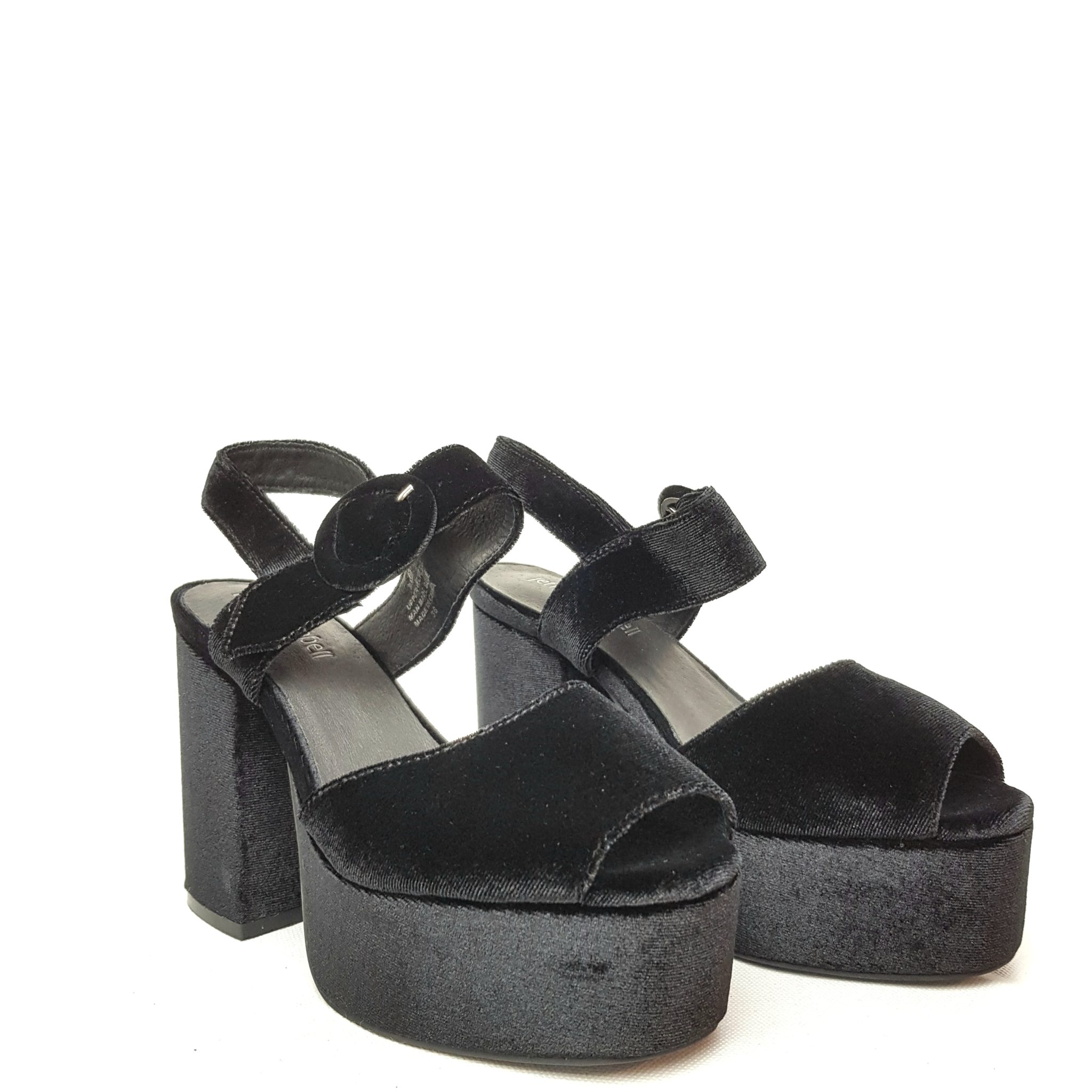 Sandalo in velluto nero. Allacciatura tramite fibbia. Tacco: 10 cm Plateau: 4 cm. Sottopiede imbottito. Fondo gomma.