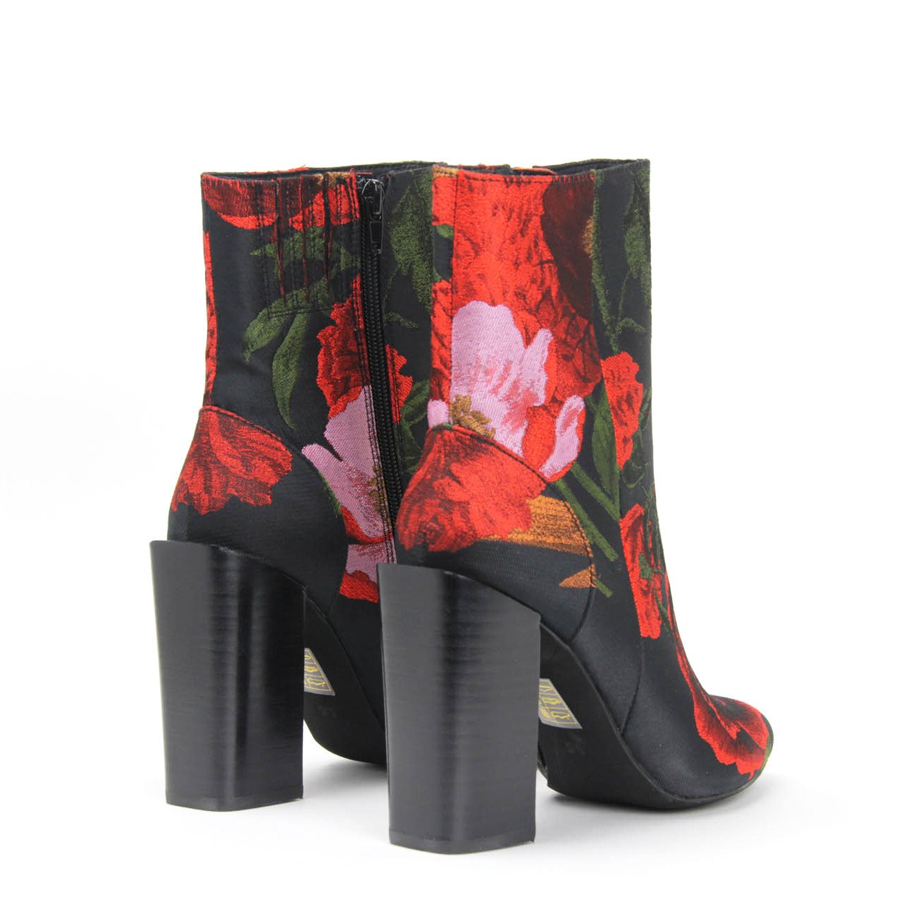 Tronchetto in tessuto Brocade floreale. Colori principali: nero e rosso. Allacciatura con zip laterale. Tacco a blocco 10 cm. Fondo gomma artificiale.