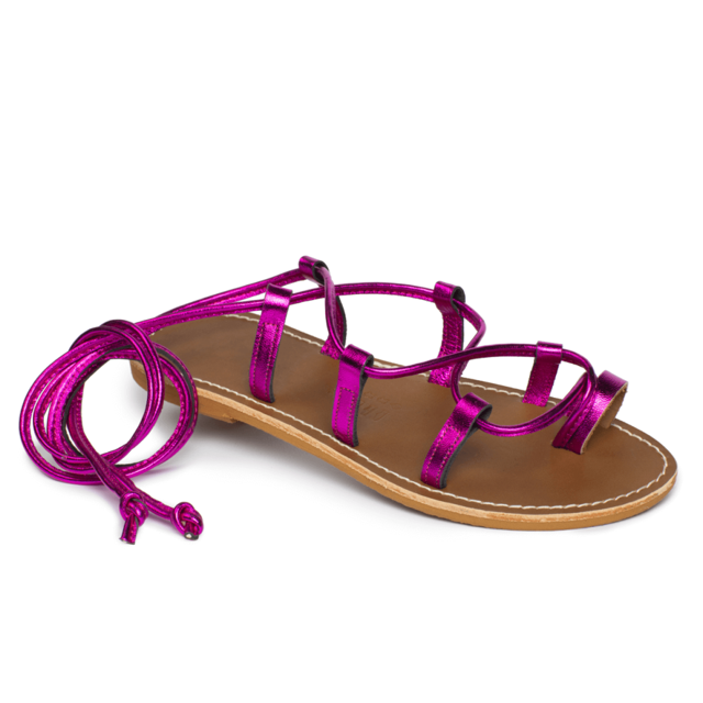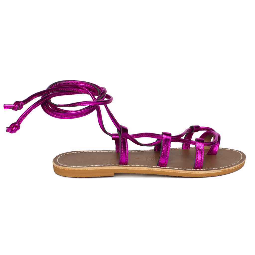 Il sandalo in pelle laminata fuxia presenta un design alla schiava con un elegante anello al dito anulare e lacci lunghi da legare alla caviglia o da intrecciare lungo il polpaccio. La sua versatilità lo rende perfetto per ogni occasione, sia che tu stia creando un outfit casual o elegante. I sandali alla schiava donano quel tocco di originalità che renderà il tuo look davvero speciale. sottopiede in cuoio e suola gomma
