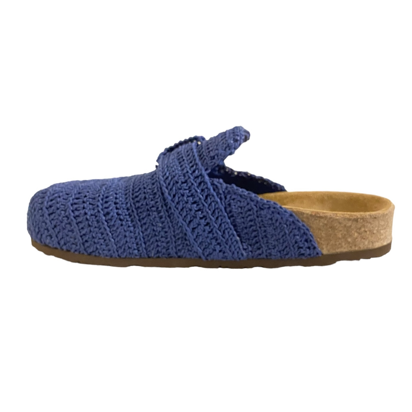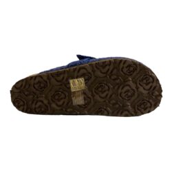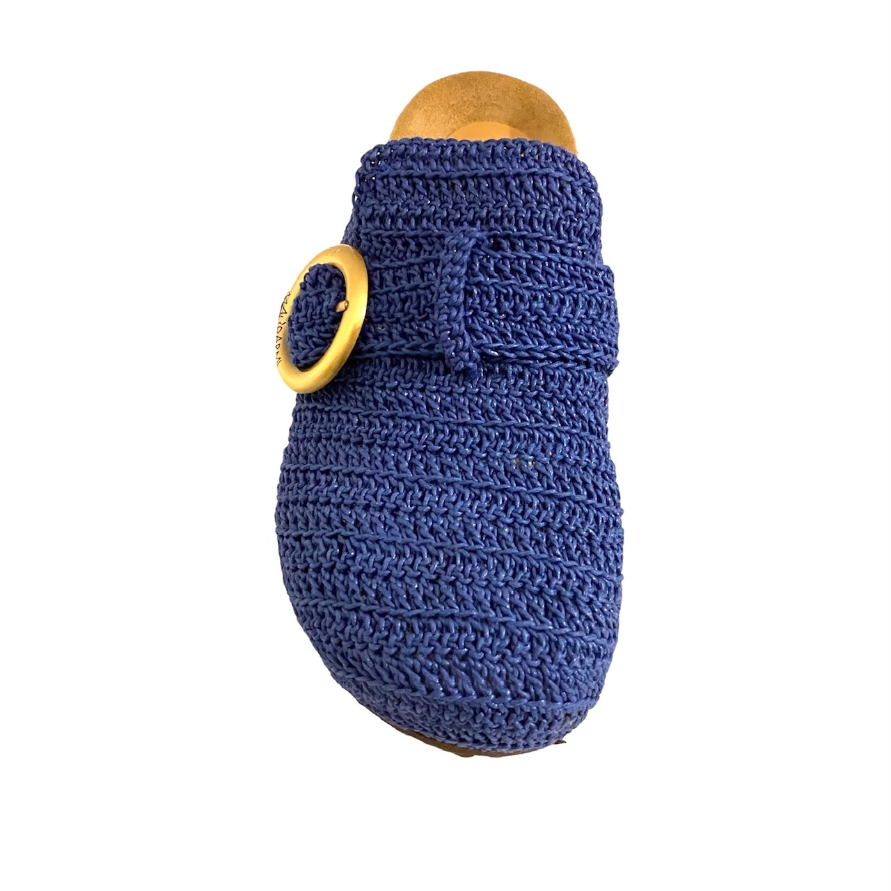Sabot con tomaia in filo blu royal 100% PL lavorato a crochet foderata pella, regolabile da sibbia in oro satinato.