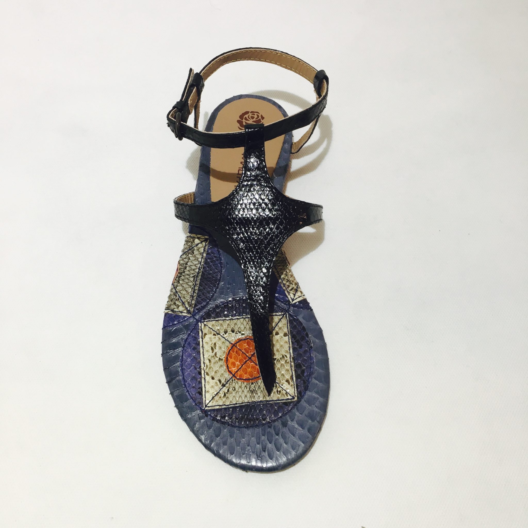Maliparmi, sandalo infradito in pelle rettile nero, con sottopiede imbottito in pelle rettile patchwork, suola in cuoio.