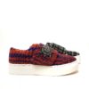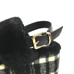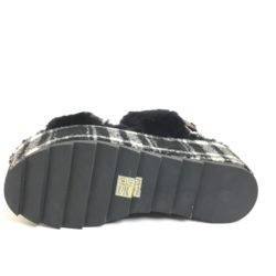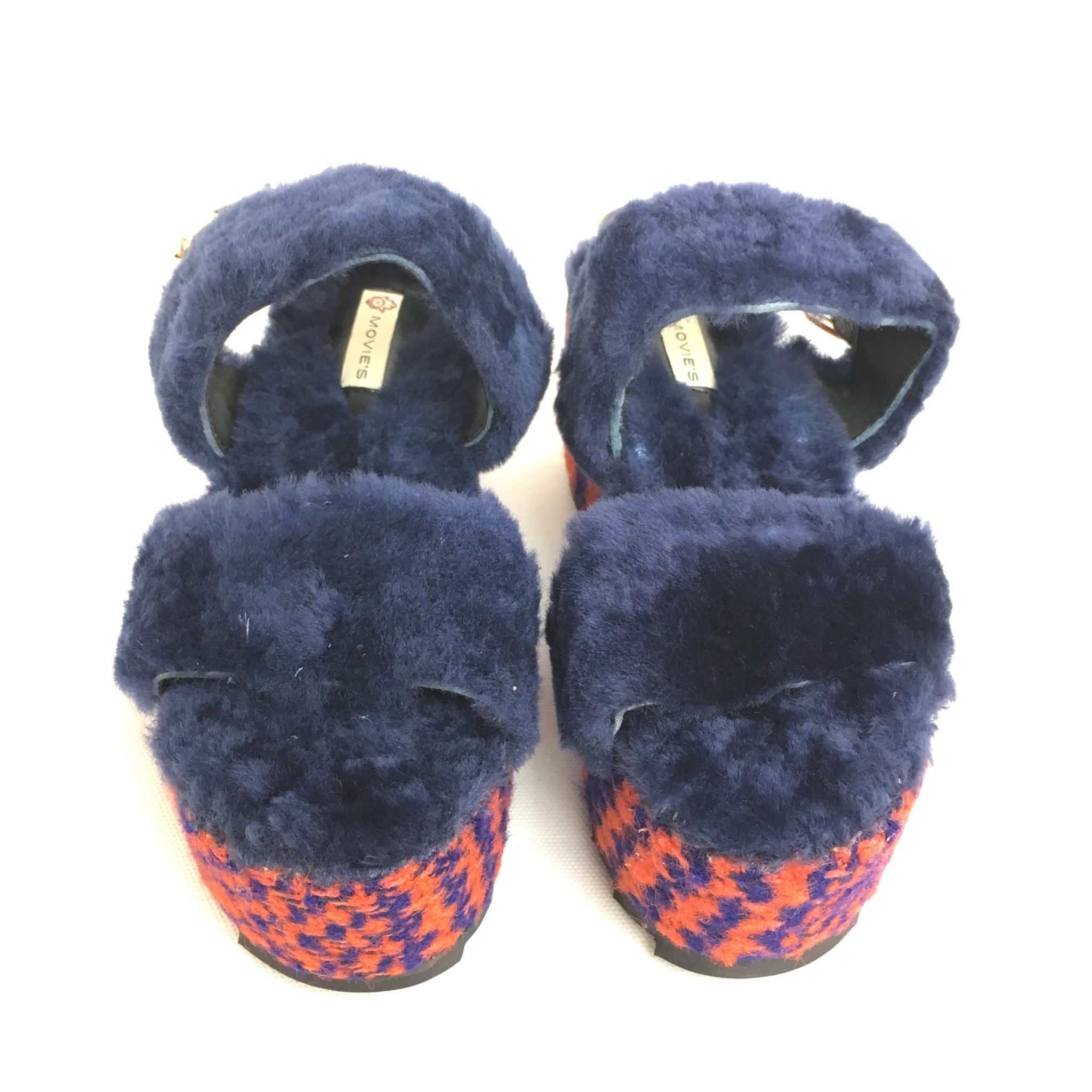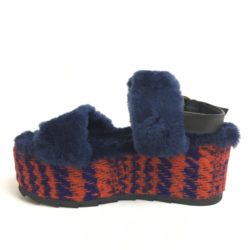 Movie’s sandalo a doppia fascia in ecopelliccia con dettaglio zeppa in stampa pied de puole. Colorazioni: blu-orange e grey-black. Allacciatura con cinturino in pelle. Zeppa 7 cm.