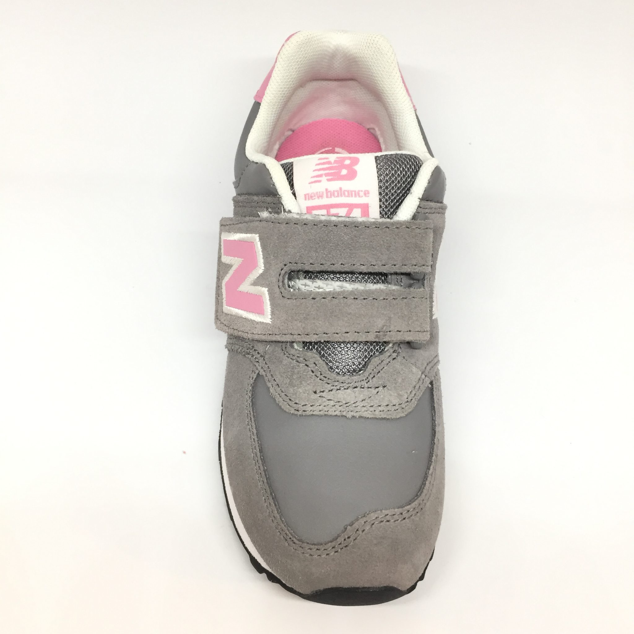 Ginnico bimba in pelle scamosciata. Colorazione: grigio con dettagli rosa. Allacciatura a strappo.