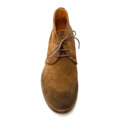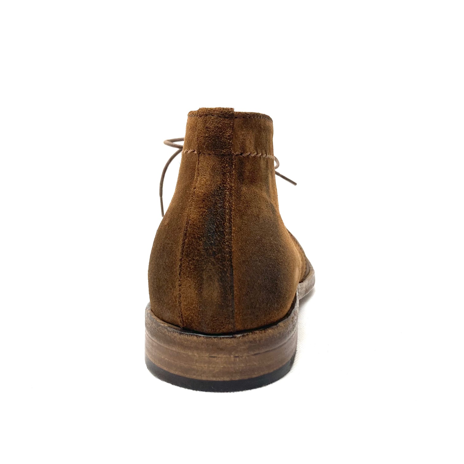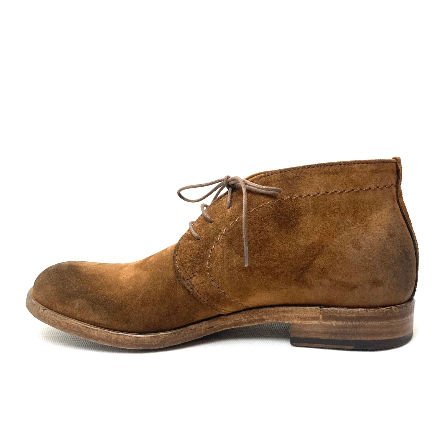 Polacco in pelle scamosciata wash, color cuoio invecchiato, allacciatura a tre fori, fondo cuoio e gomma. 100%