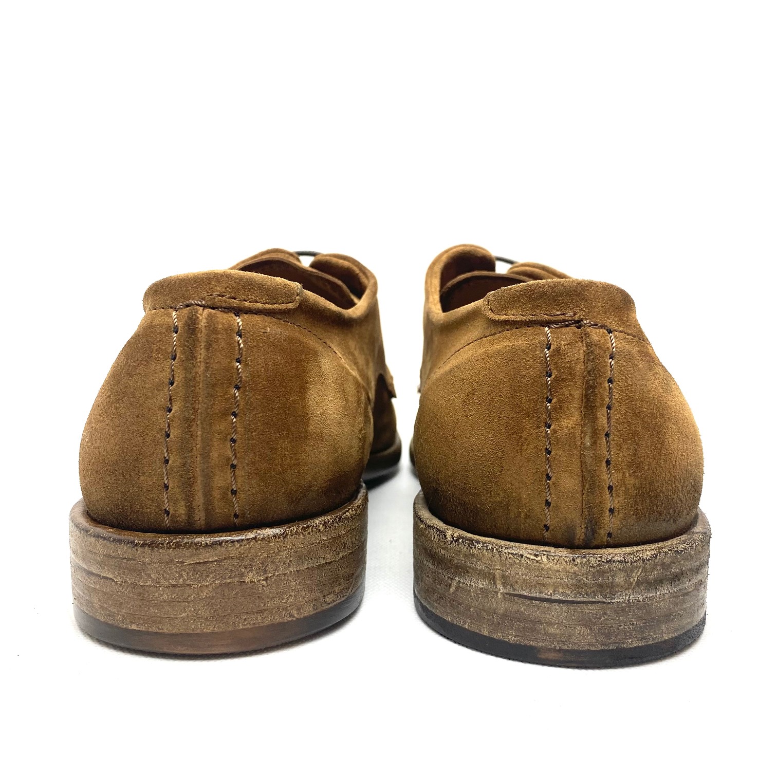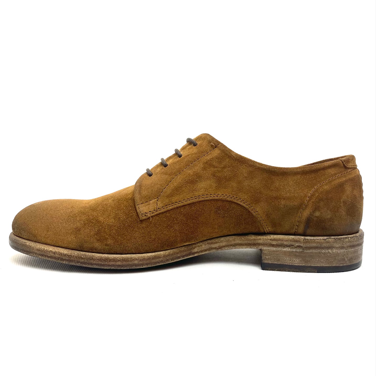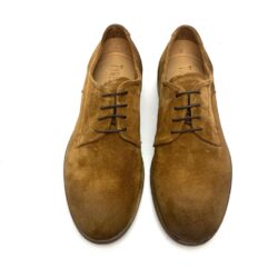 Scarpa derby 4 fori in camoscio cognac invecchiato, fodera pelle, suola cuoio e gomma, 100% Made in Italy