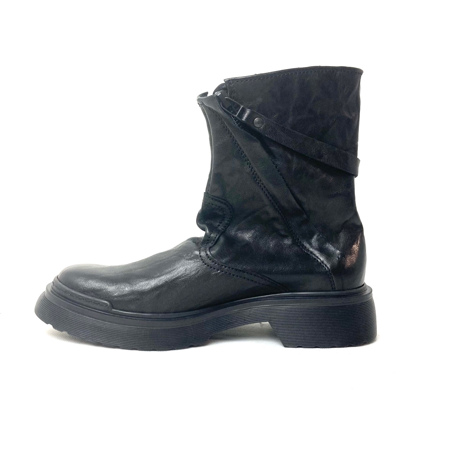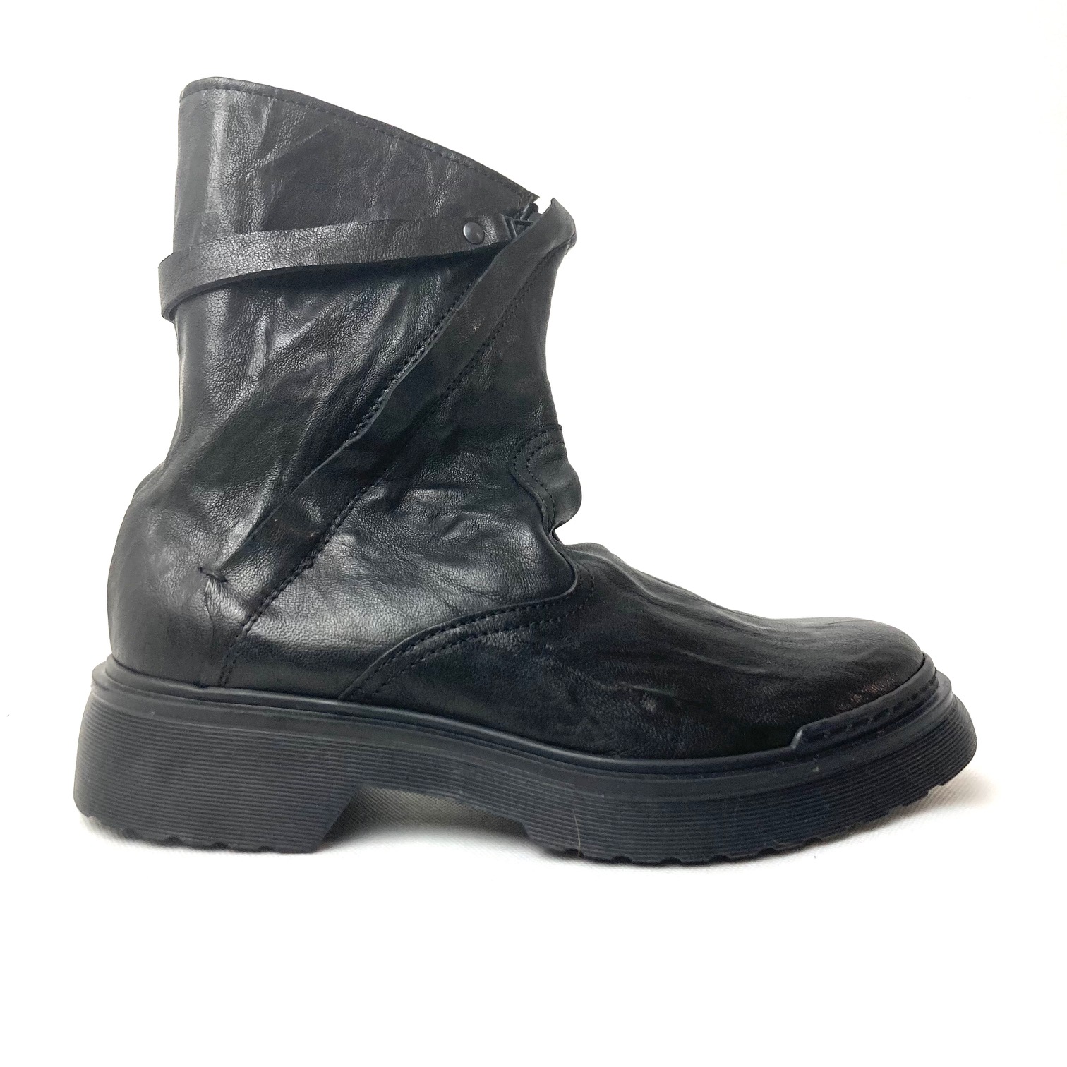 Tronchetto nero in pelle rodeo effetto stropicciato, gambale h cm 17, apertura con doppia zip laterale a taglio obliquo, suola in gomma, cm 2. Calzata regolare.100% Made in Italy