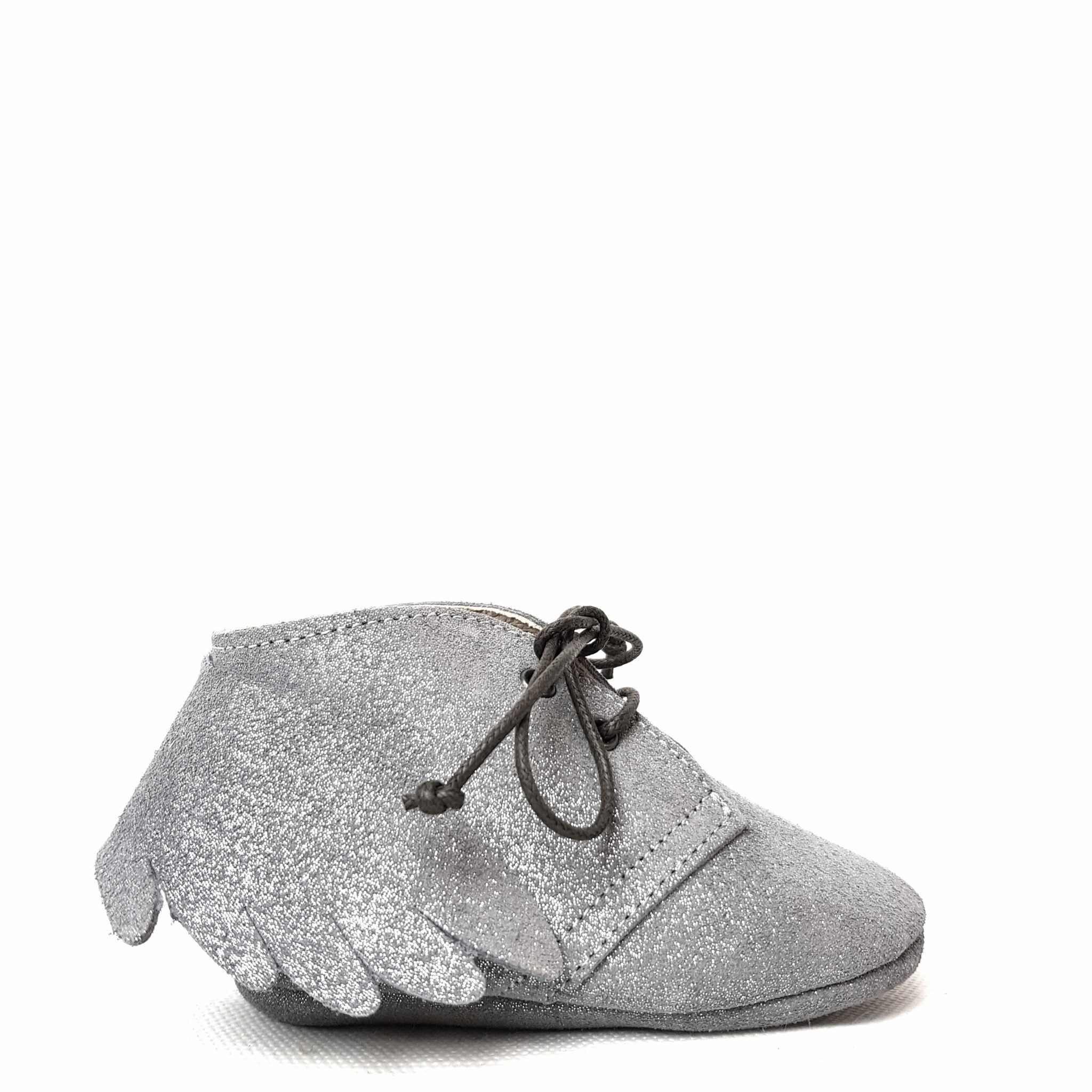 Scarpina culla in vera pelle. Colore grigio glitter. Dettaglio ali. Made in Italy