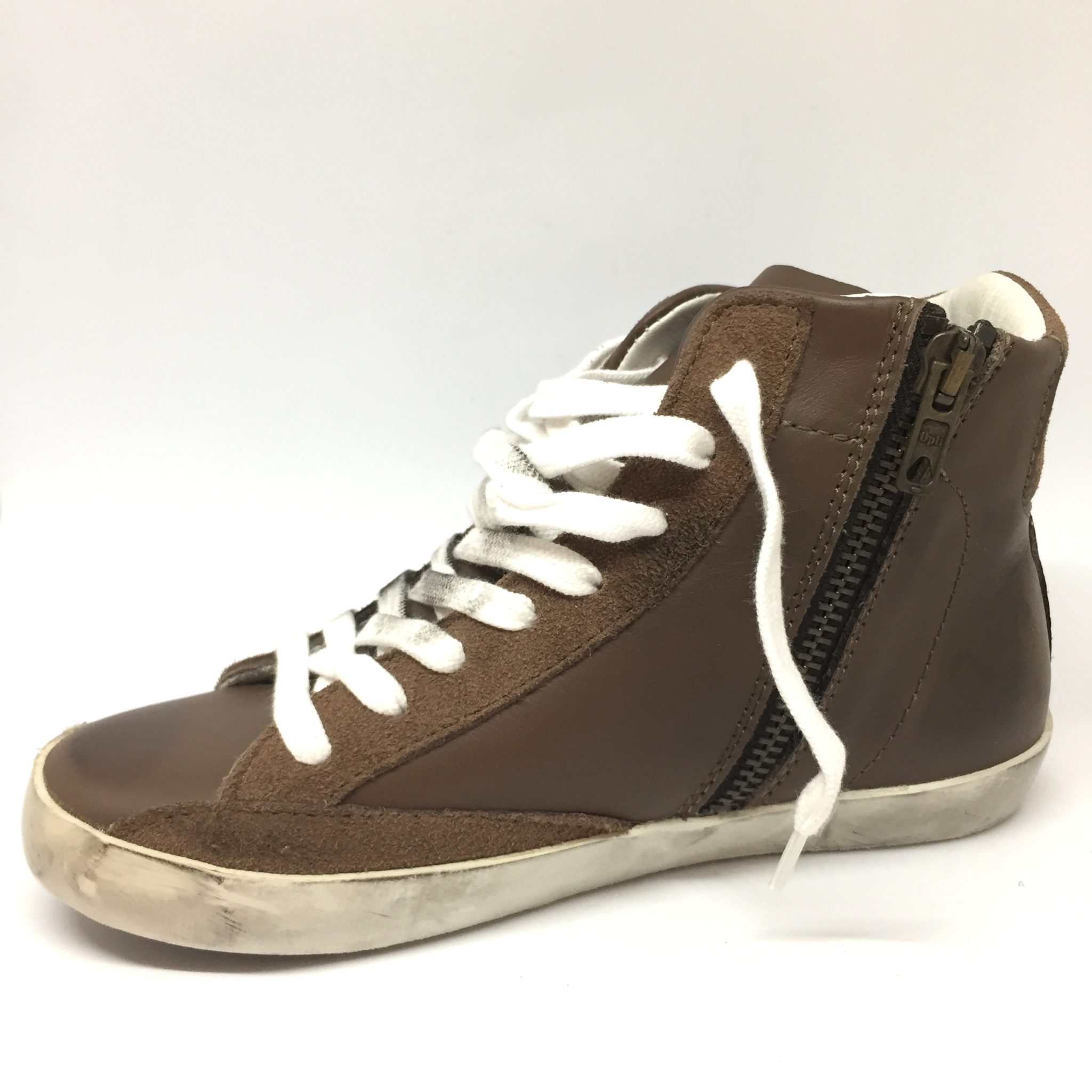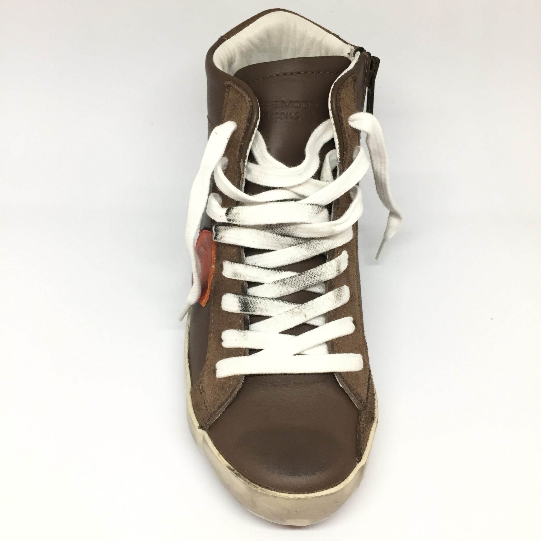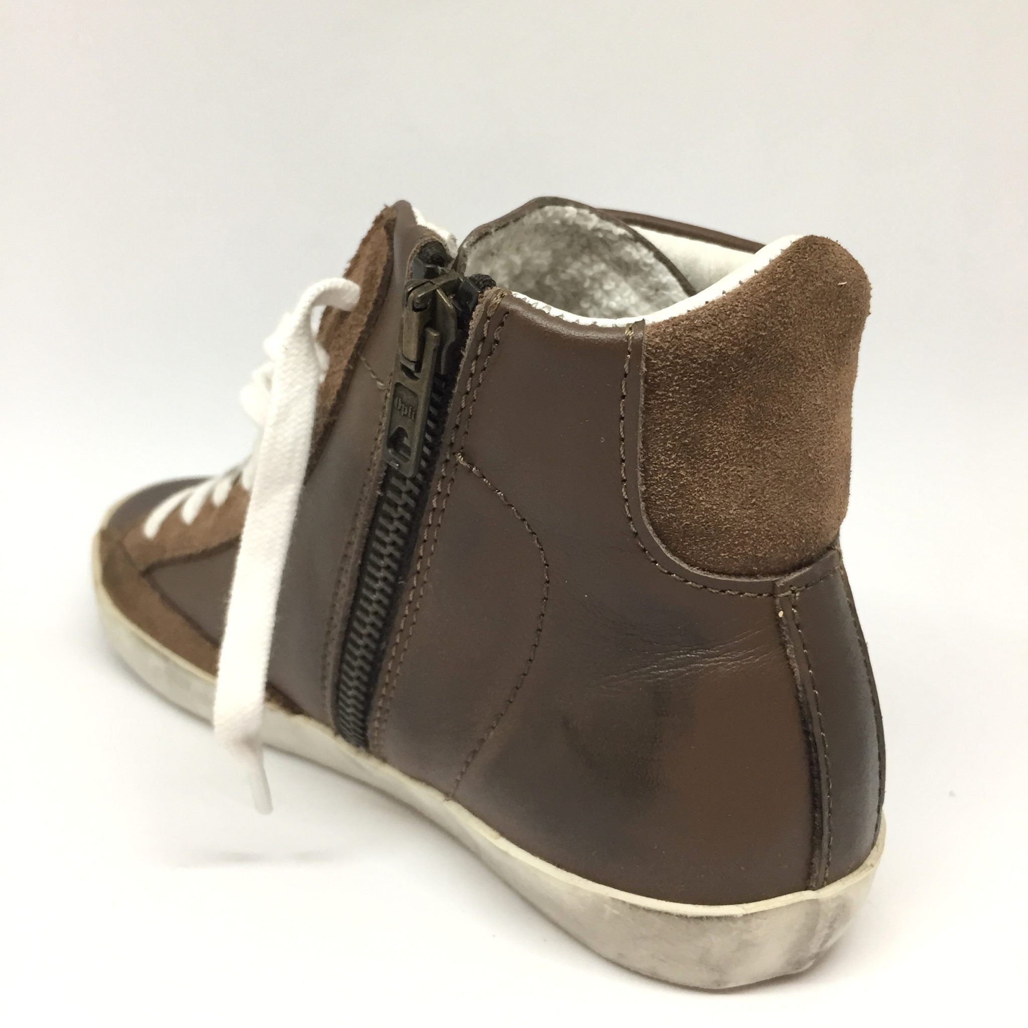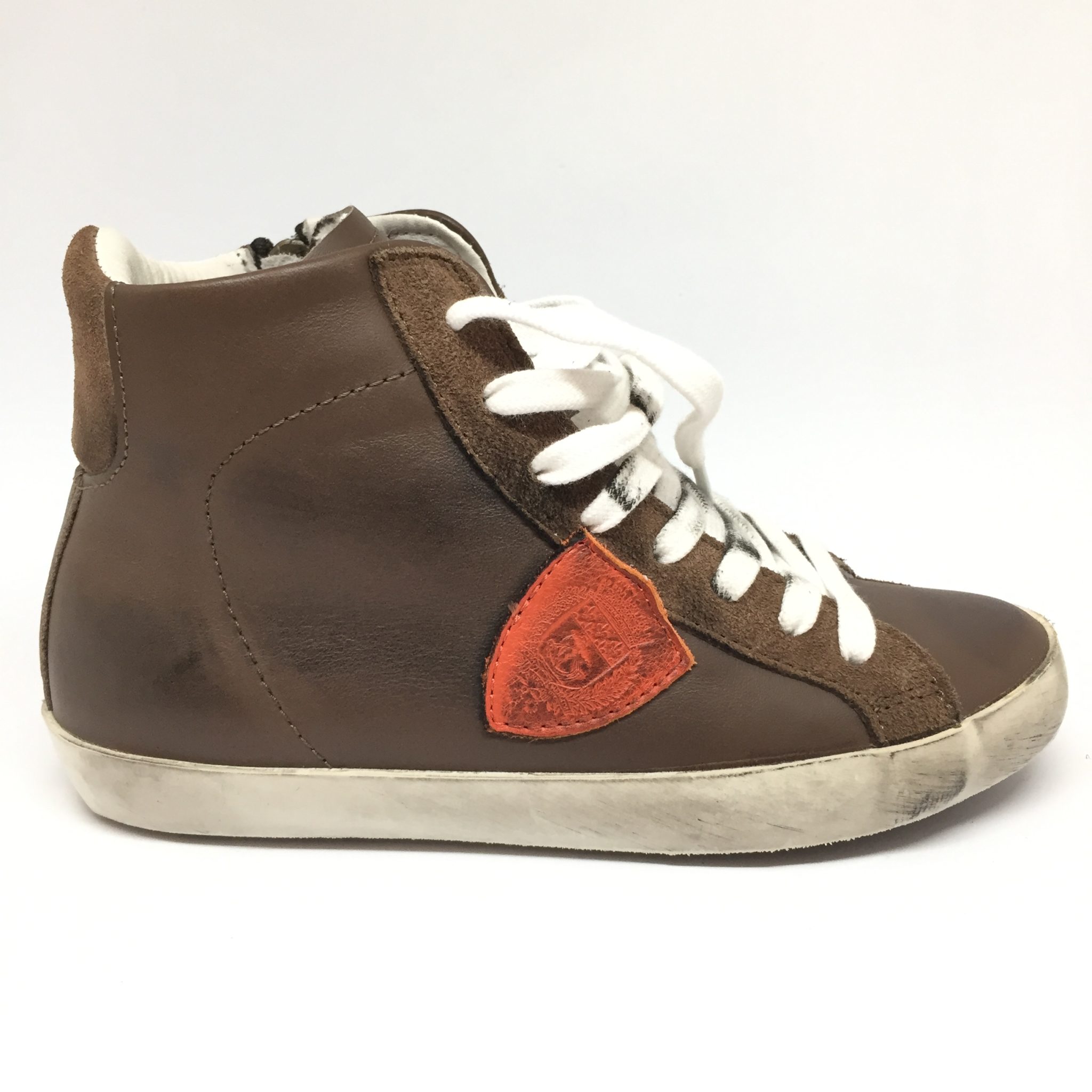 Ginnico bimbo alto in pelle testa di moro con scudo arancio. Allacciatura:stringa e zip laterale. Plantare anatomico.