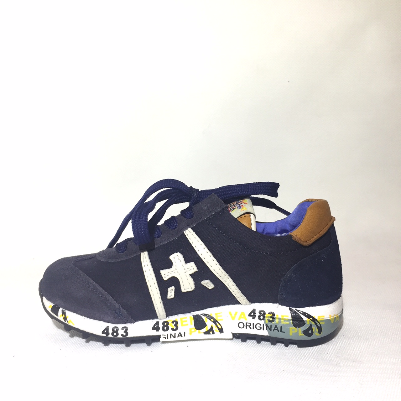 Ginnico bimbo in tela e pelle scamosciata blu, dettagli bianco e cuoio. Suola in gomma