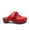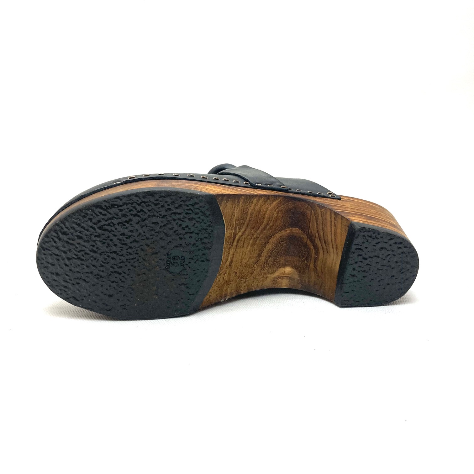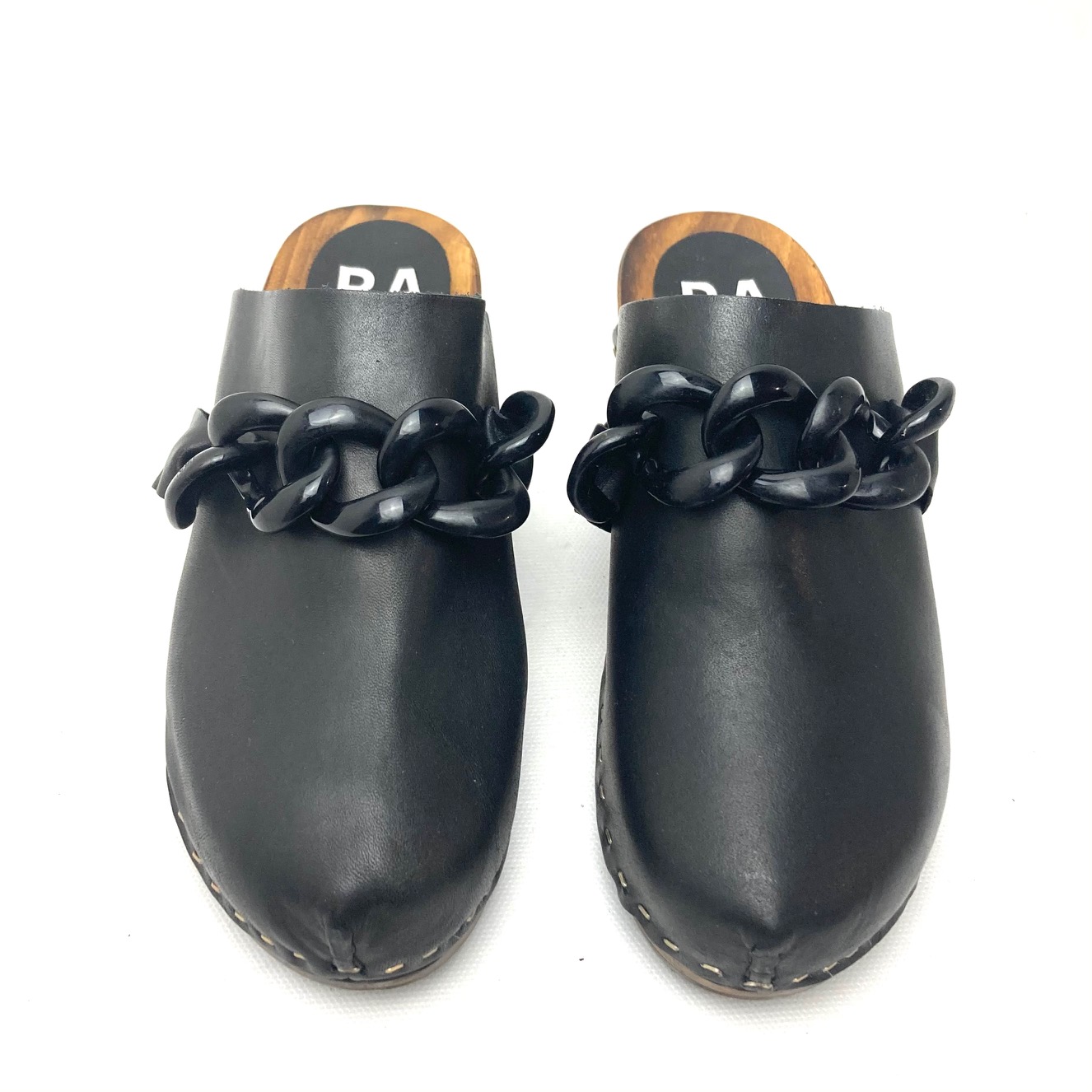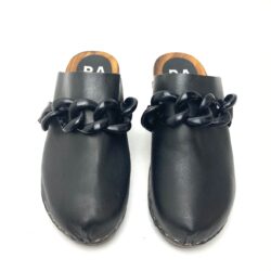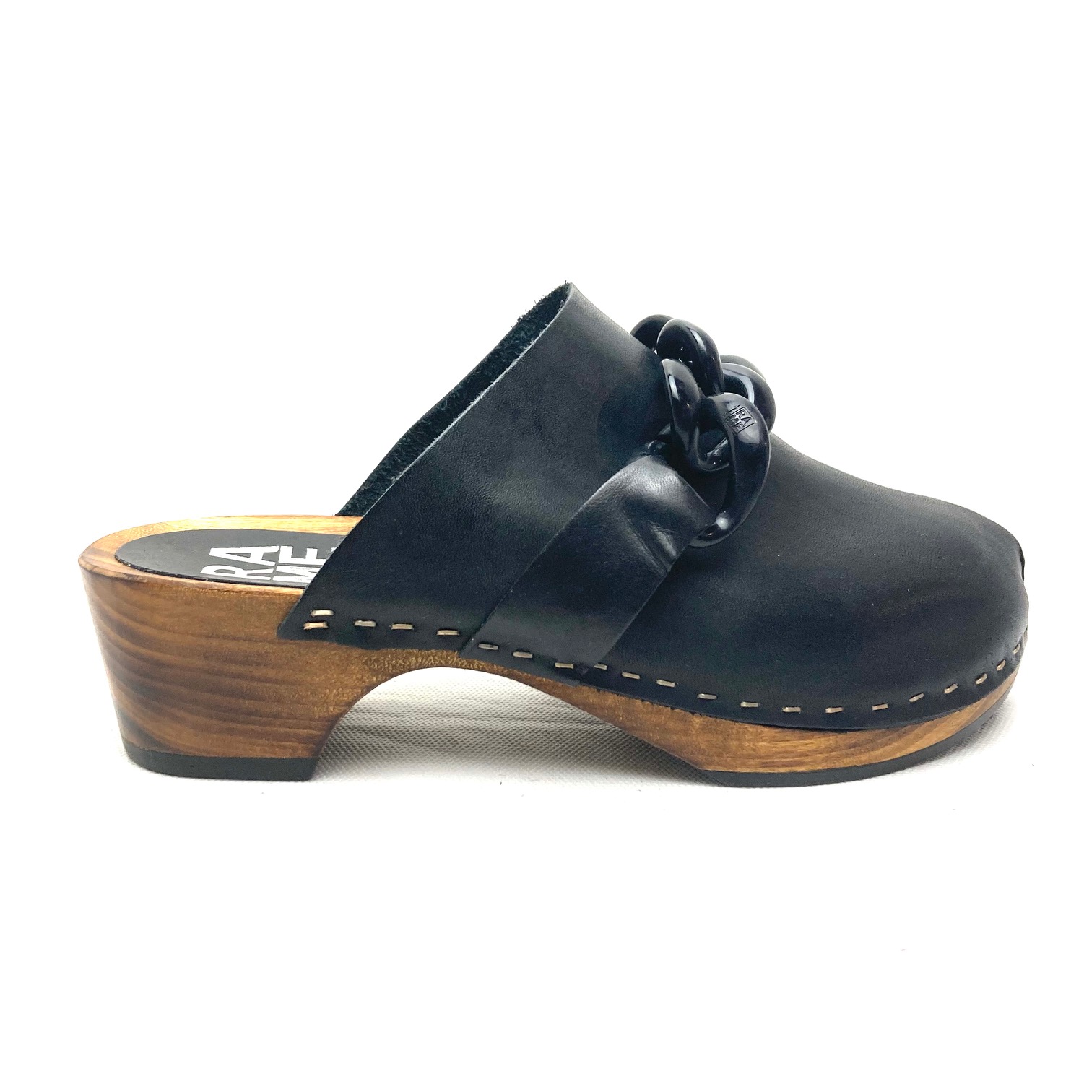 Zoccolo fondo legno tacco cm 5, suola cm 2, in vitello nero con accessorio catena in plastica. sottopiede in legno fondo gomma.